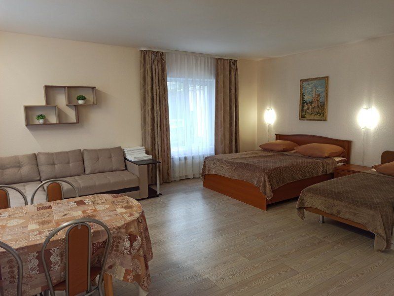 Одна односпальная кровать, одна двуспальная кровать, одна диван-кроватьВ гостиничном номере