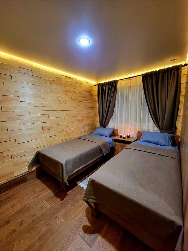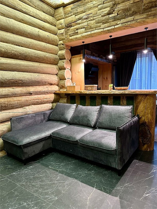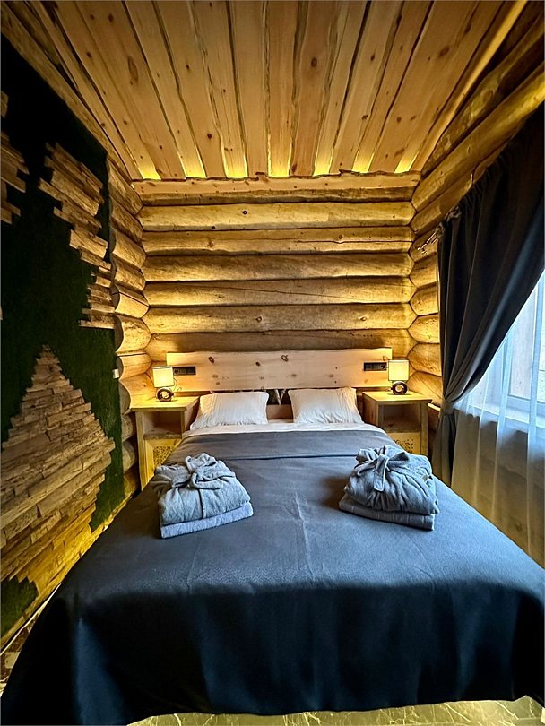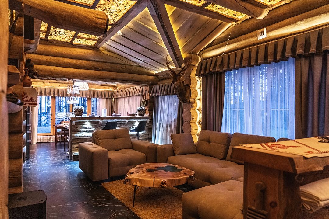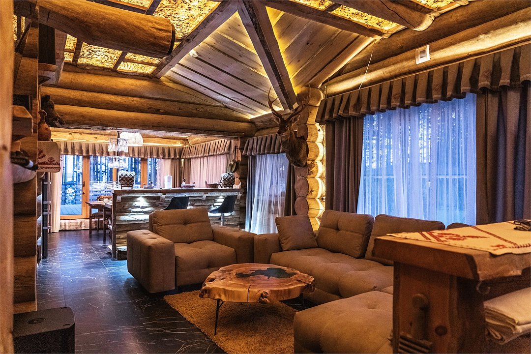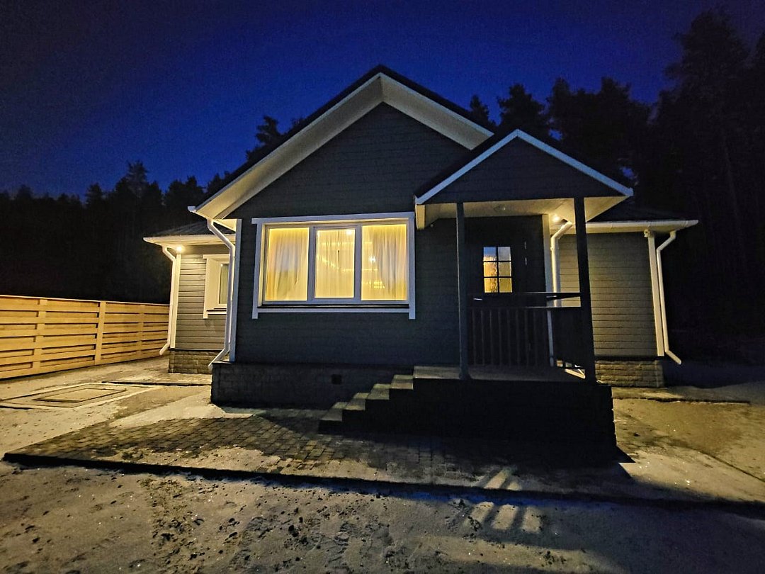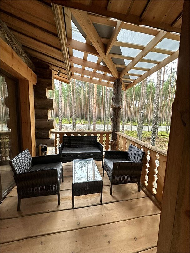 Просторный дом площадью 142 м2, построенная из карельской сосны кело. В доме одна спальная комната с большой двухместной кроватью, гостинная с угловым диваном, Дополнительно можно воспользоваться и попариться в русской бане, которая оснащена профессиональными печами и 4 купелями. На открытой террасе японская купель фурако Большая гостиная для теплых посиделок. Услуги парения и массажа.Услуги и удобства