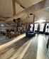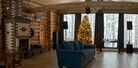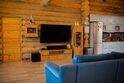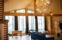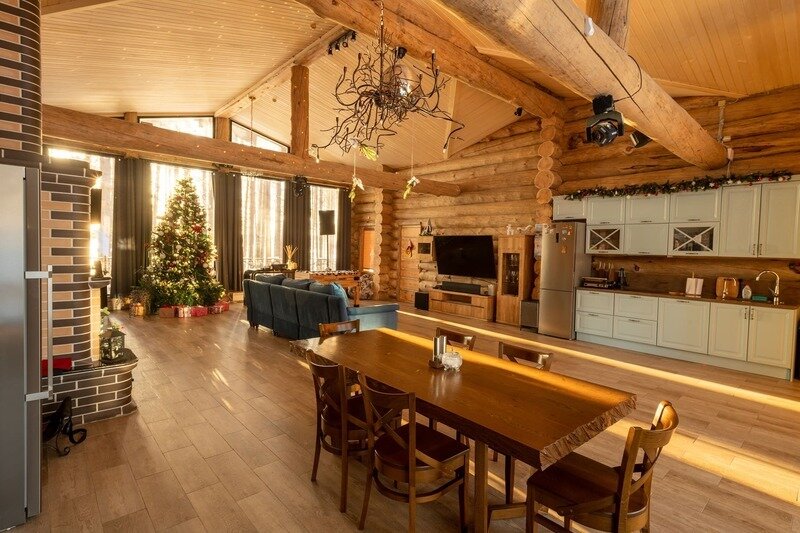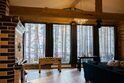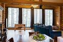 • Просторная гостиная с русской печью-лежанкой и камином. Панорамные окна с видом на сосновый бор и озеро.
