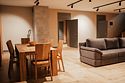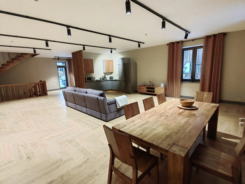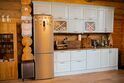 • На втором этаже просторная кухня-гостиная со всей необходимой техникой (холодильник, посудомоечная машина, электрическая плита, чайник, кофемашина) и посудой, большой обеденный стол на 14 человек, мягкий диван, телевизор, колонка Алиса.