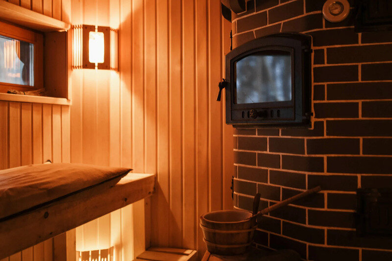 - дровяная печь, широкие полки для парения лежа в полный рост;