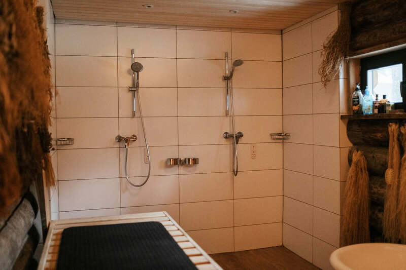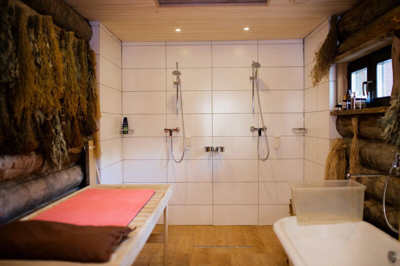 В бане нет душа, помыться после парения гости могут в своих домиках.