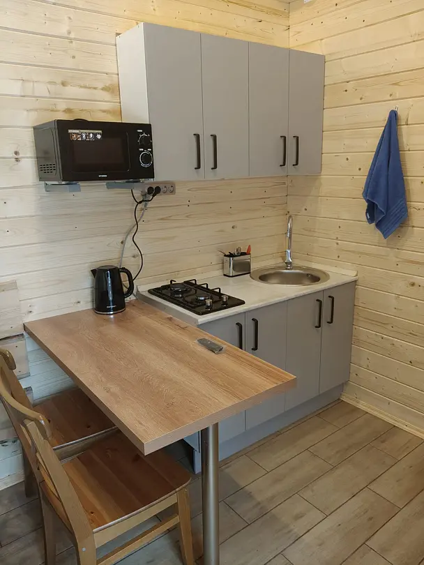 Дом оборудован всей необходимой мебелью и бытовой техникой (чайник, турка, холодильник, микроволновая печь, духовка, четырехконфорочная индукционная плита, посудомоечная машина. Посуда на 6 персон.