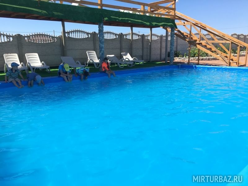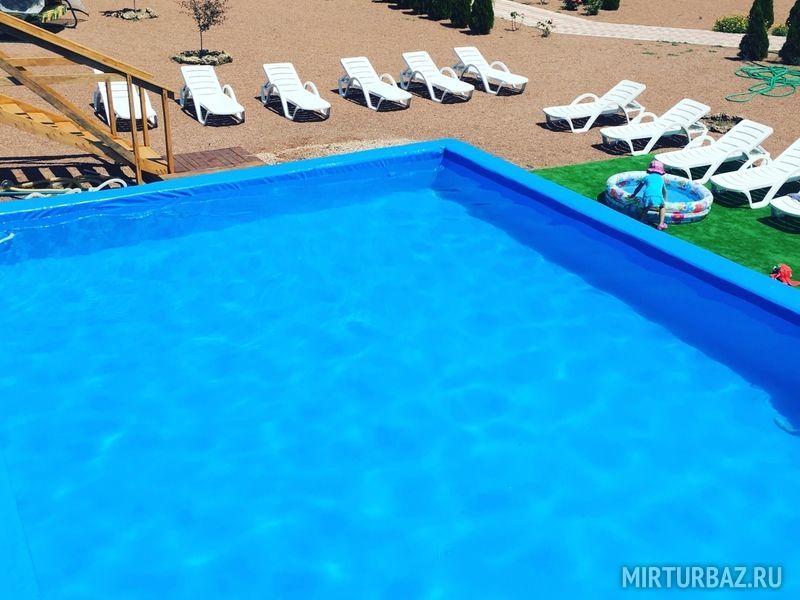 На территории также находится большой бассейн с шезлонгами и солярием, парковка, мангал и барбекю, а маленькие гости смогут покататься на качелях и попрыгать на батуте. Сеть Wi-Fi ловит во всех номерах и в любом уголке двора.