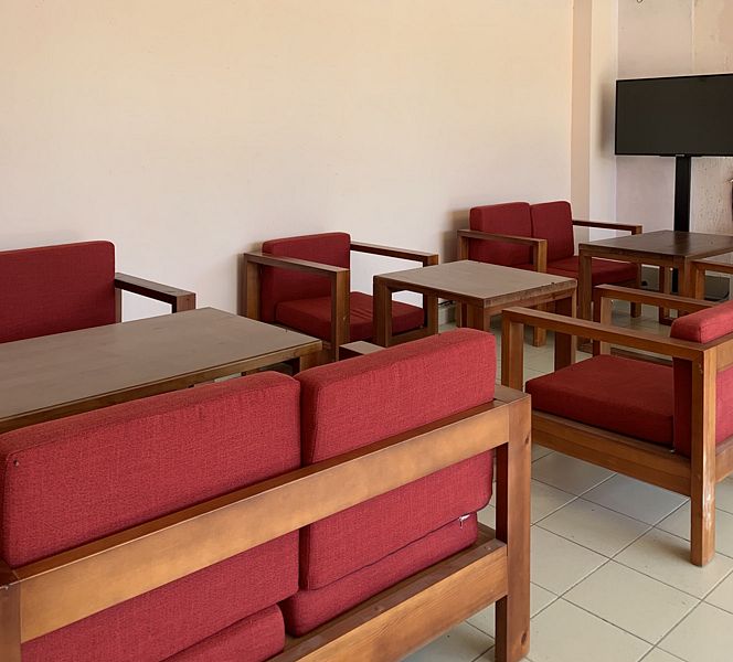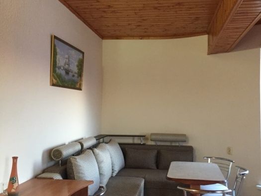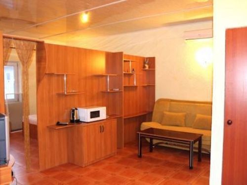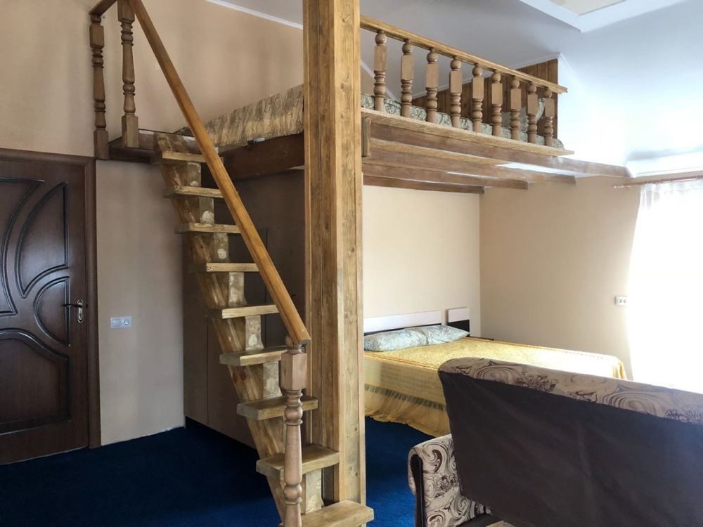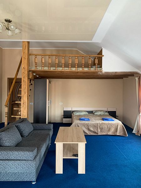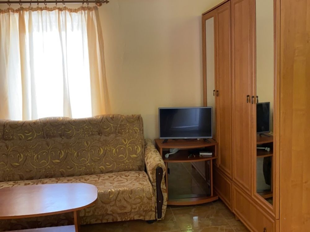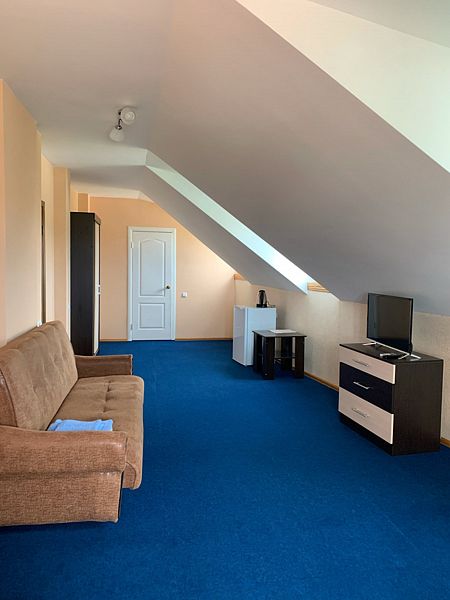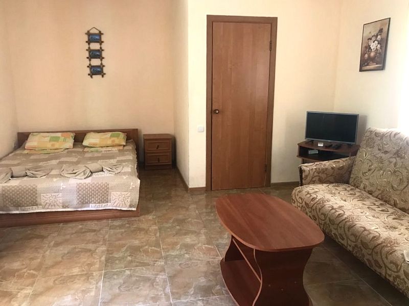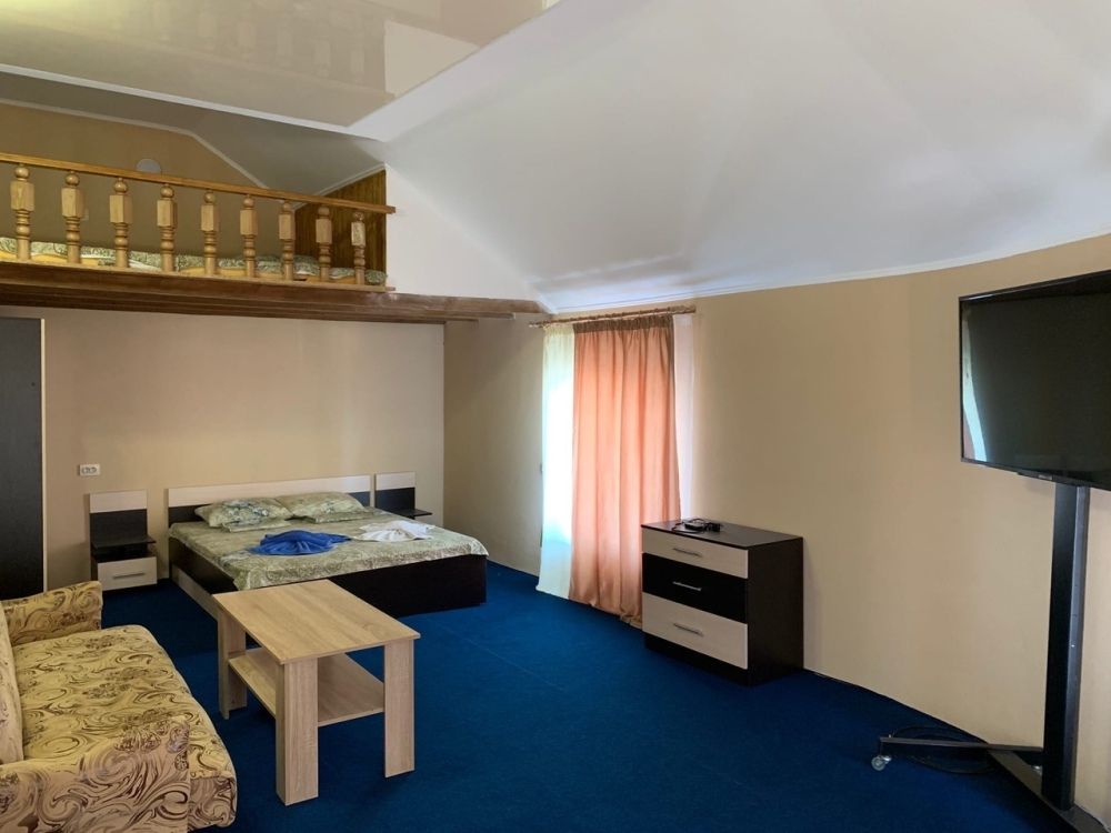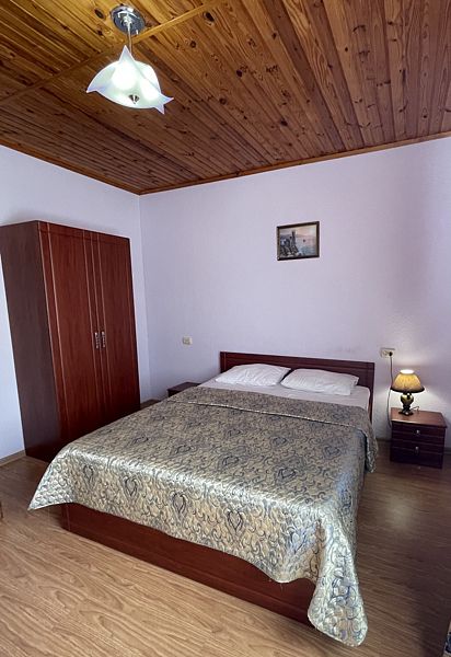 Оборудование: телевизор, спутниковое, цифровое тв, холодильник, кондиционер, фен, электрочайник, средства личной гигиены Удобства: туалет и душ в номере, санузел совмещенный Мебель: 1 двуспальная кровать, 1 односпальная кровать, 1 диван-кровать, детская кроватка (по запросу) Дополнительно: С видом на бассейн и на море Полулюкс двухкомнатный есть 2.Один номер с мебельной перегородкой с видом на море и на бассейн(№23).Возле номера терраса со столом и со стульями. Второй номер( №17)видом на палисадник с двумя смежными , раздельными комнатами.Возле номера терраса со столом и со стульями.В гостиничном номере