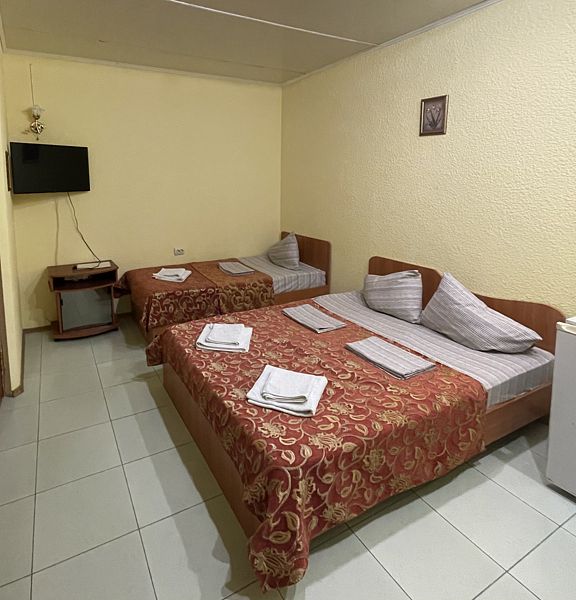 Оборудование: телевизор, спутниковое, цифровое тв, холодильник, кондиционер, фен, электрочайник, средства личной гигиены Удобства: туалет и душ в номере, санузел совмещенный Мебель: 3 односпальных кровати, детская кроватка (по запросу)В гостиничном номере
