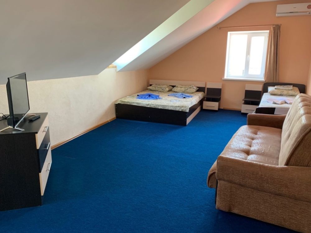 Оборудование: телевизор, спутниковое, цифровое тв, холодильник, кондиционер, электрочайник, средства личной гигиены Удобства: туалет и душ в номере, санузел совмещенный Мебель: 1 двуспальная кровать, 1 односпальная кровать, 1 диван-кровать, детская кроватка (по запросу)В гостиничном номере