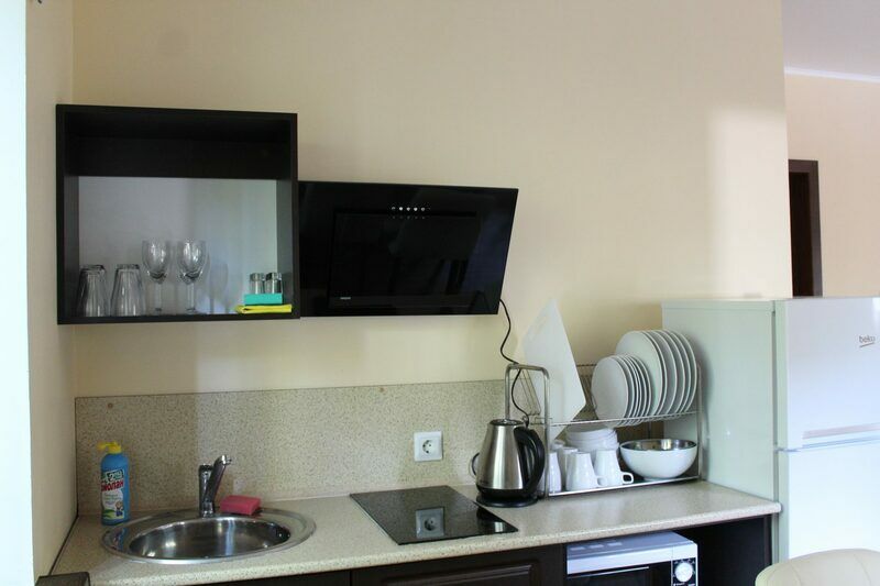 и бытовой техникой: есть телевизор с плоским экраном, фен, электрочайник, в коттеджах также оборудованы кухни.