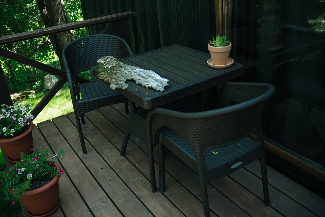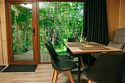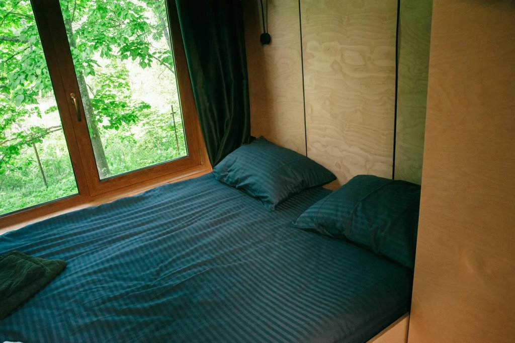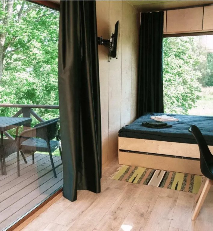 В доме с панорамными окнами объединенная спальня-гостиная с комфортной двуспальной кроватью, отдельная ванная комната с душем и туалетом, кухня полностью оборудована техникой и посудой, открытая терраса с удобной мебелью и мангалом