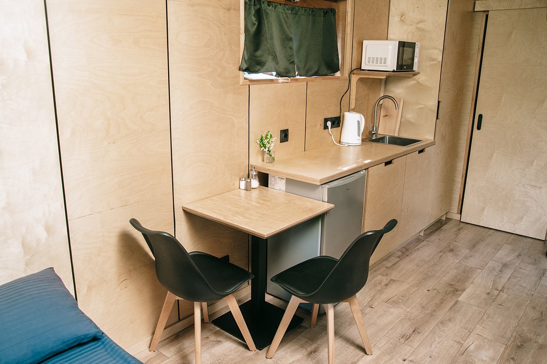 Стильный дом-контейнер с открытой террасой, сочетающий безусловный комфорт и функциональный минимализм вместимостью до 3-х человек (2 взрослых и ребенок до 12 лет)