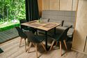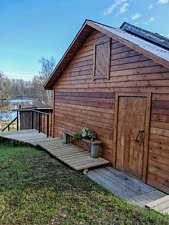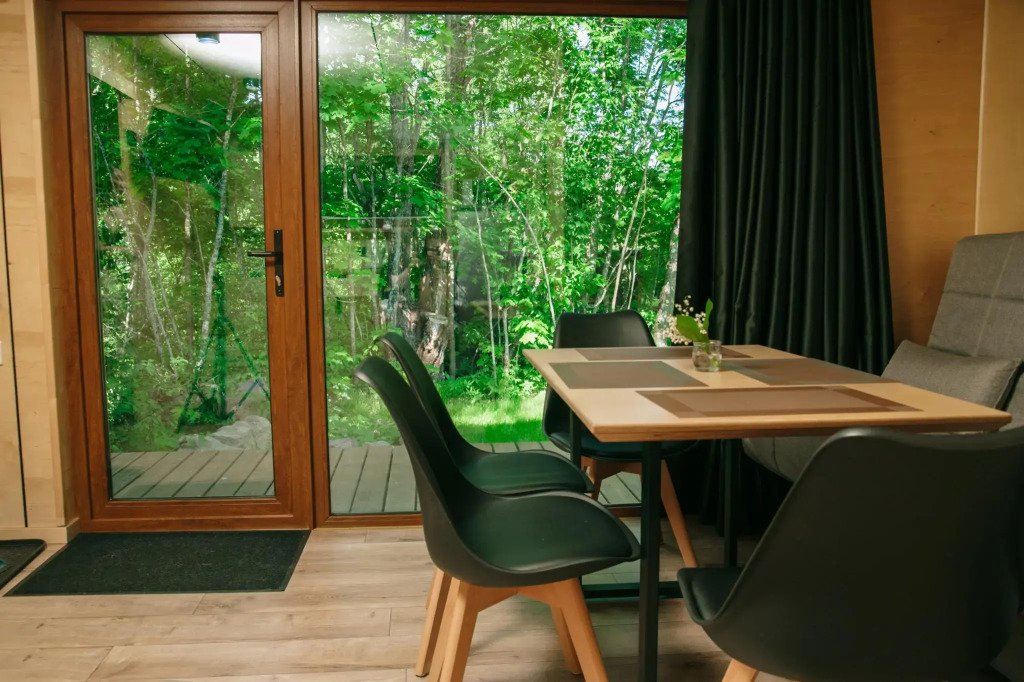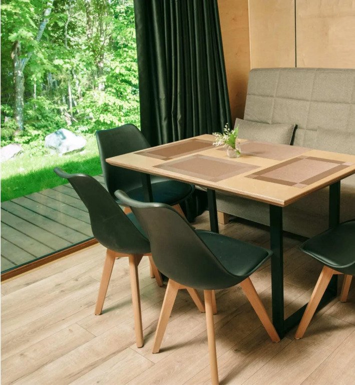 В доме с панорамными окнами объединенная кухня-гостиная с удобным двухместным диваном, две отдельные спальни с комфортными двуспальными кроватями, отдельная ванная комната с душем и туалетом, кухня полностью оборудована техникой и посудой, открытая терраса с мебелью и подогреваемой купелью