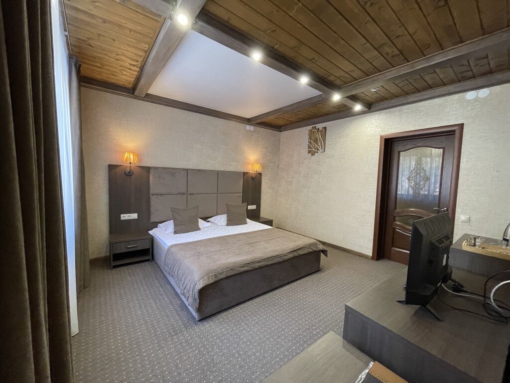 Номер для двоих с одной большой двуспальной кроватью, шкафом, мини-холодильником и телевизором. В номере своя ванная комната.