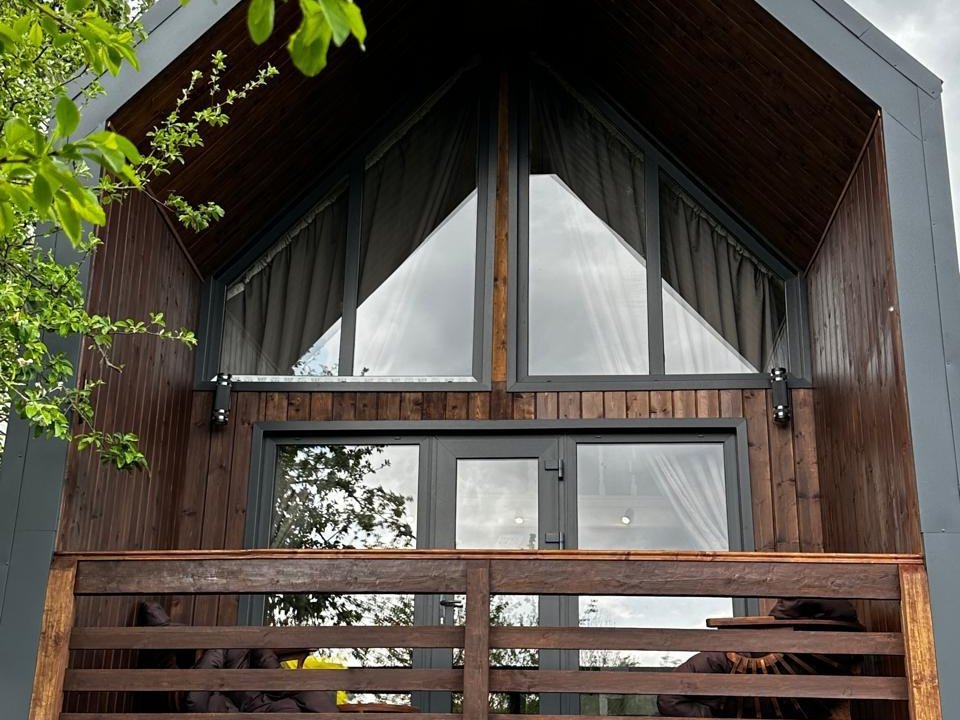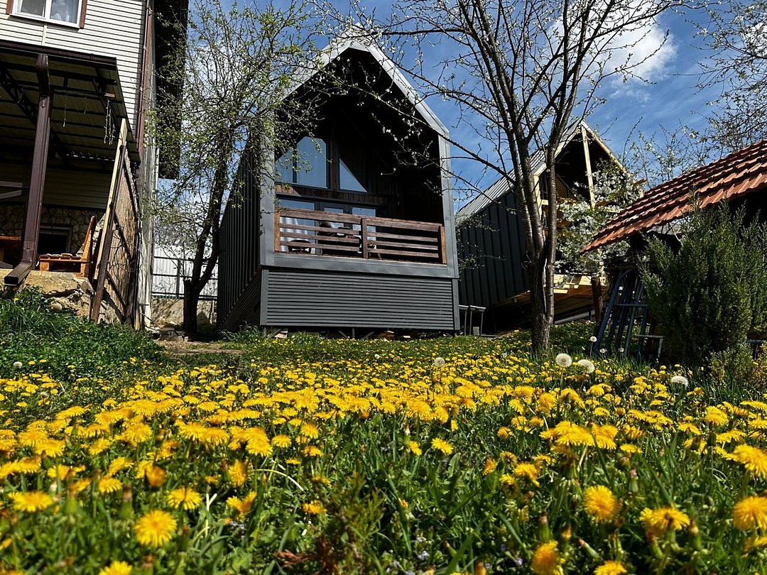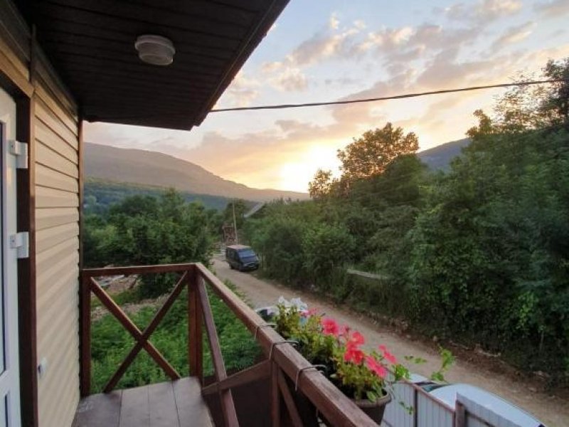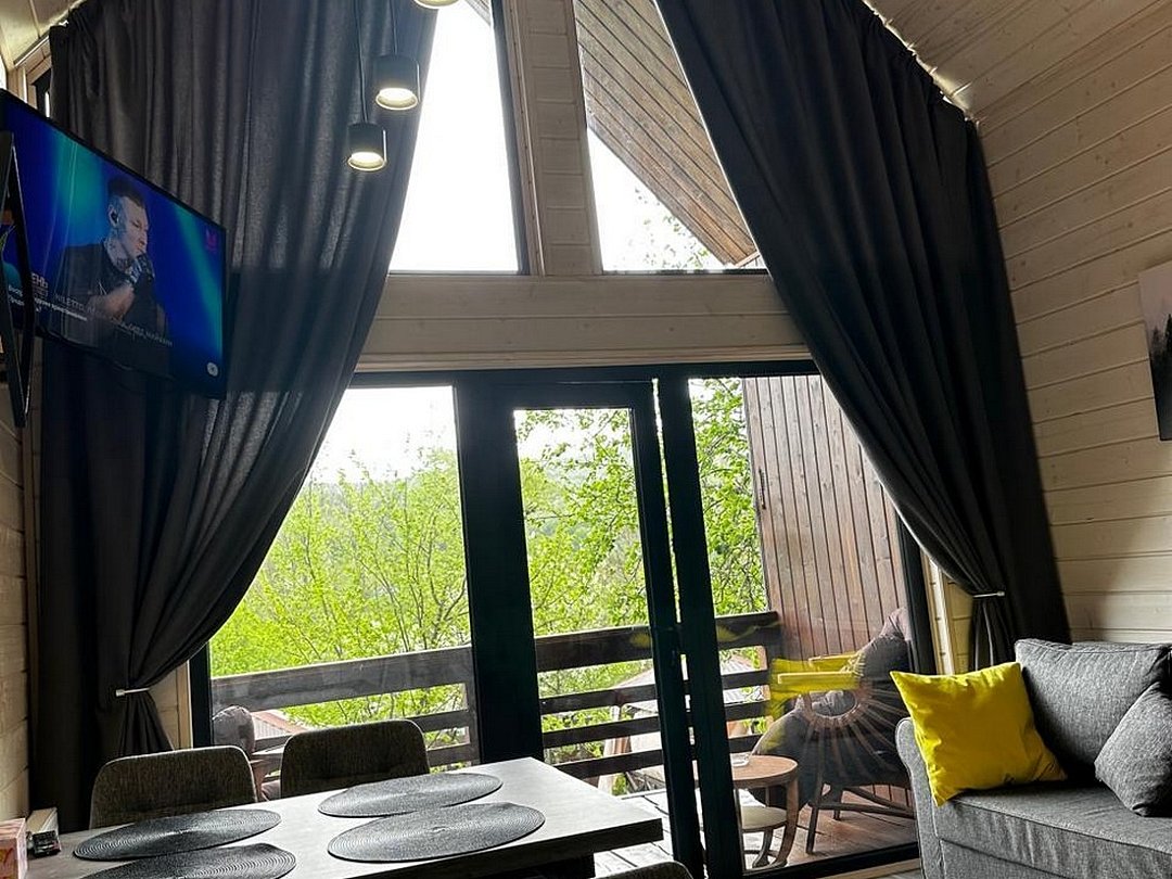 Домик четырёхместный площадью 39 кв.м с видом на горы. На террасе стол и 2 кресла. Подходит для размещения 6 человек. (4 основных места и 2 дополнительных) Имеет спальню с приятным интерьером. В номере: 1 двуспальная кровать, 1 двуспальный диван. Имеется телевизор, кондиционер, вешалка, туалетный столик, фен, мини-кухня, обеденный стол, стулья, посуда, столовые приборы, СВЧ, чайник, холодильник, отопление. Индивидуальная ванная комната: душ, раковина, туалет. В стоимость входит: постельное бельё, полотенца, мыло, тапочки, ванные принадлежности (шампунь, гель для душа, мыло) WI-Fi бесплатно на всей территории. Бесплатная частная парковка на территории.В номере