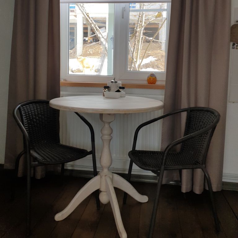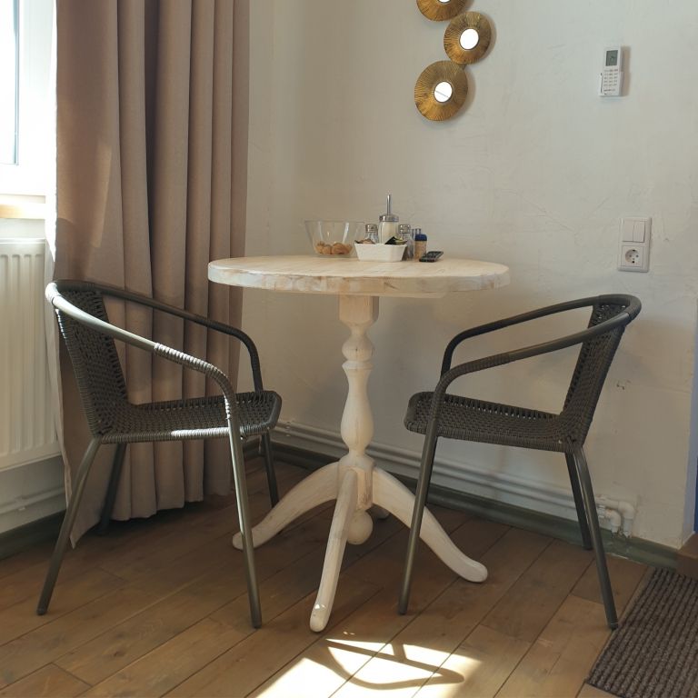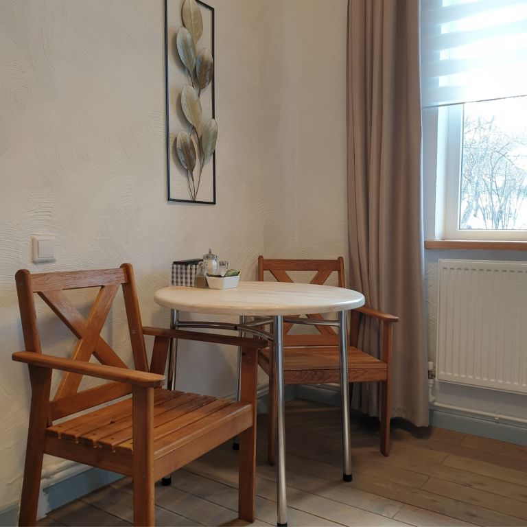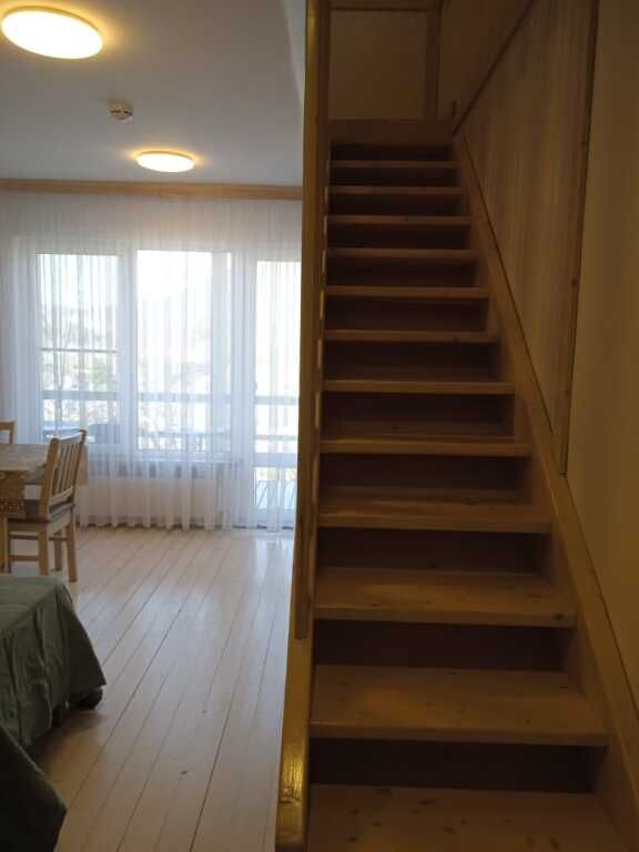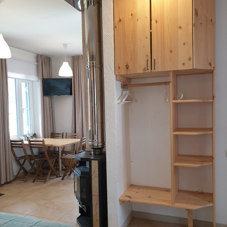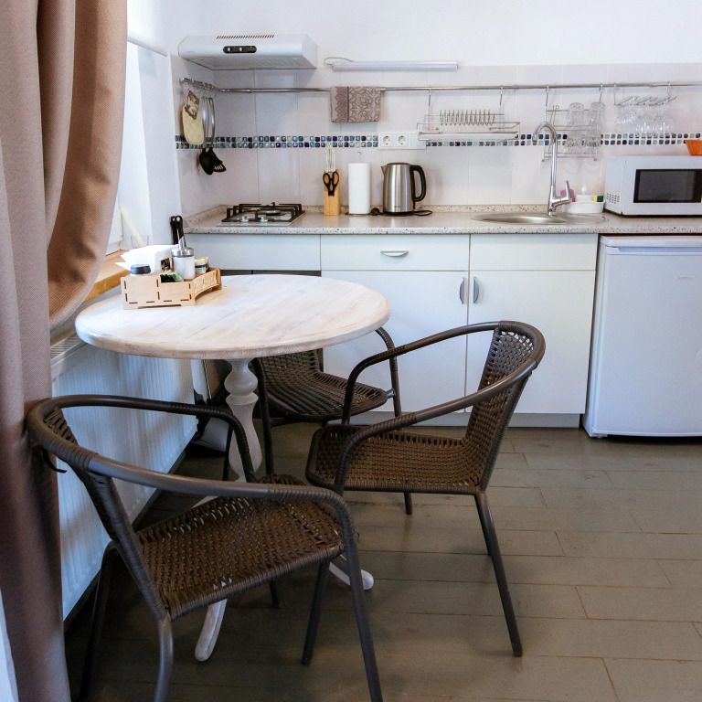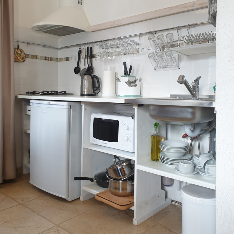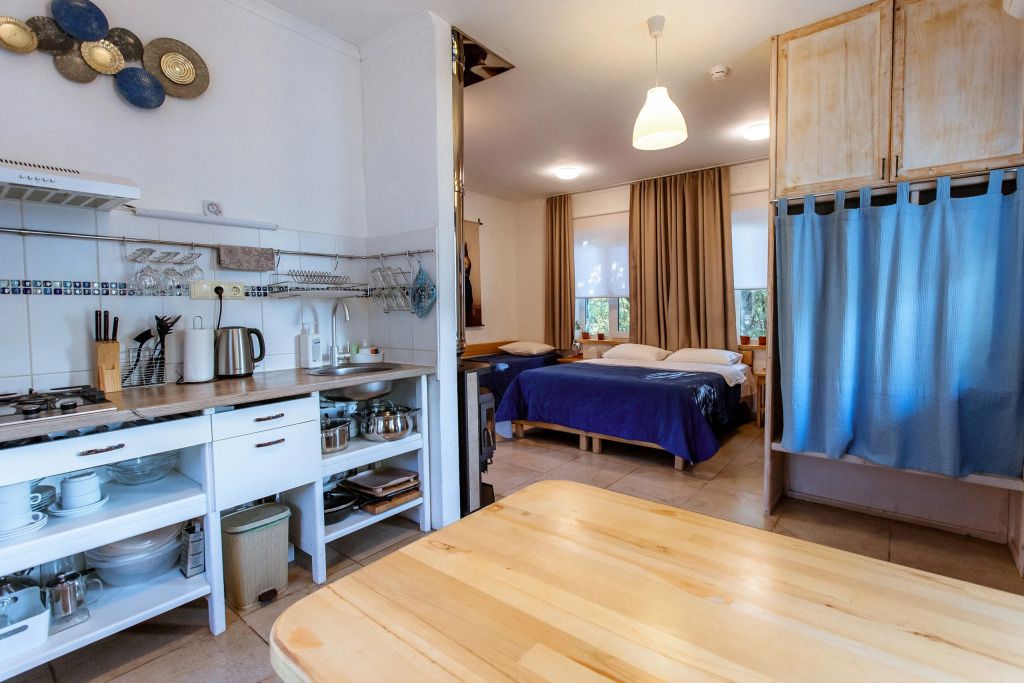 Небольшая и уютная. Кровать шириной 160 см. Можно сделать две отдельные по запросу. Дополнительное место или детская кроватка не устанавливаются. На кухне все необходимое для приготовления пищи.