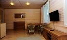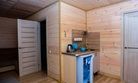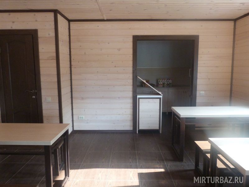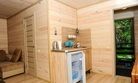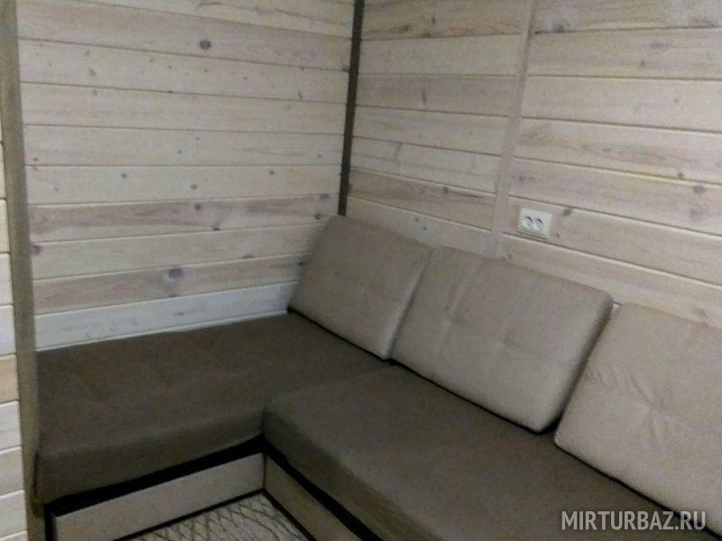 До температуры в парилке 80-90*С требуется около двух часов, посещение бани осуществляется только по предварительному заказу.Внутри бани находится зона отдыха и небольшая кухня.