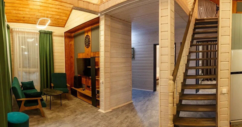 Новый двухэтажный дом-баня из бревна площадью 120 кв.м. с собственной территорией и видом на ГЛК Солнечная Долина. В доме три спальни и холл. Русская баня прямо в доме - очень удобно!