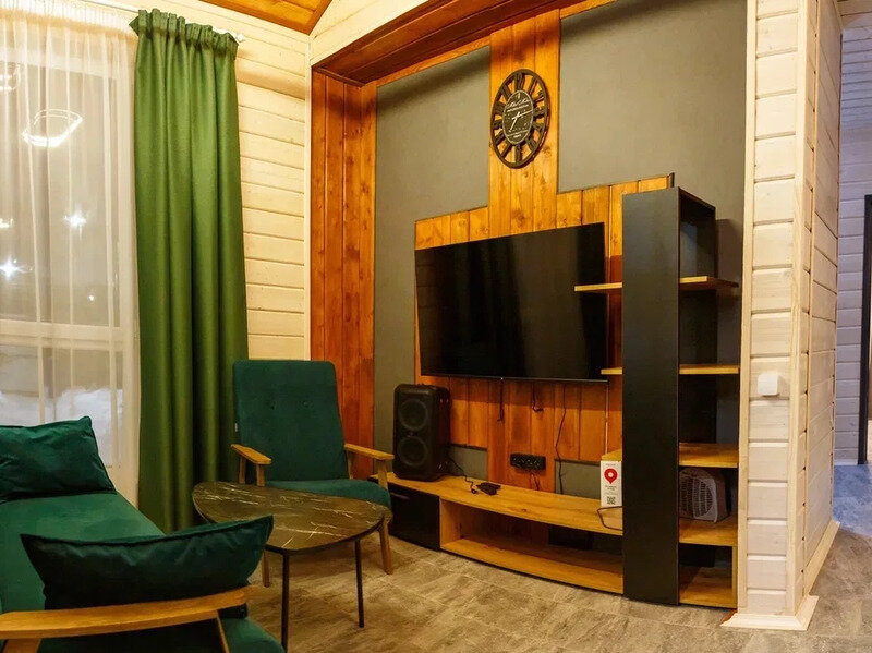 В коттедже имеются: варочная поверхность, холодильник, микроволновая печь, телевизор, аудио система, белоснежные полотенца, халаты, постельное белье.
