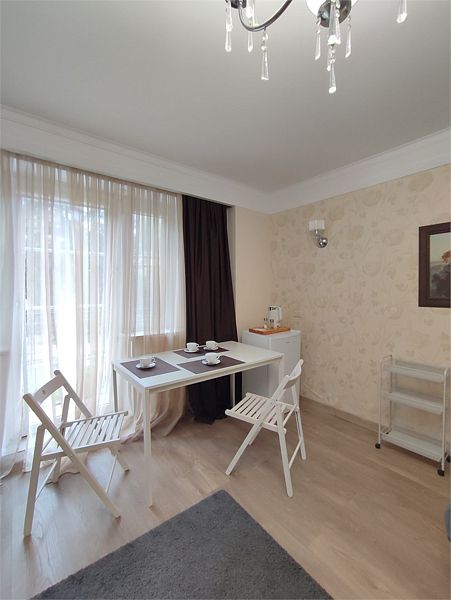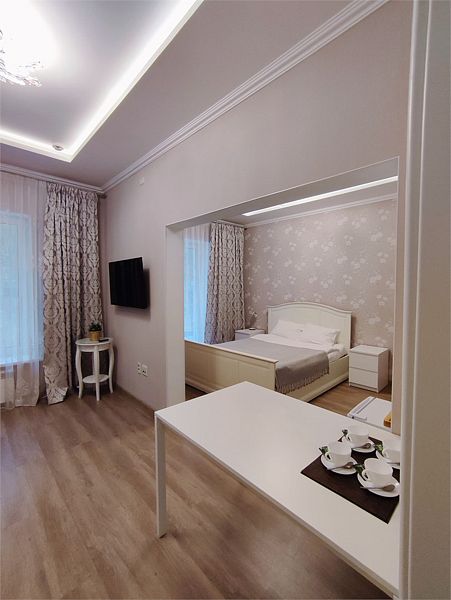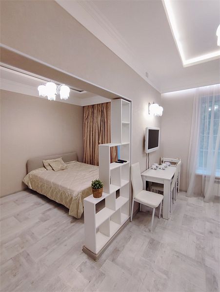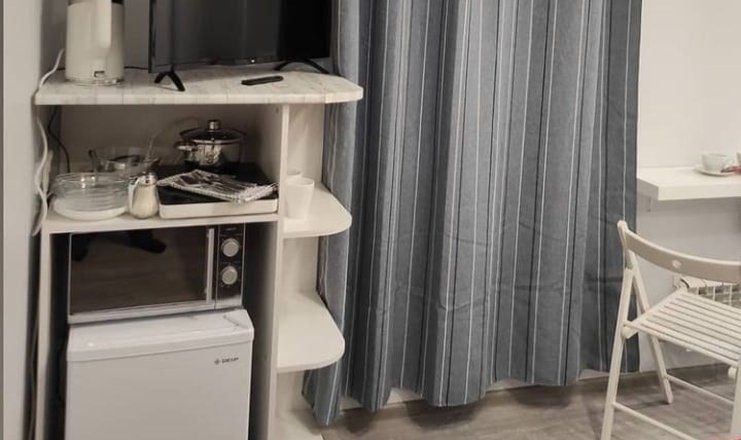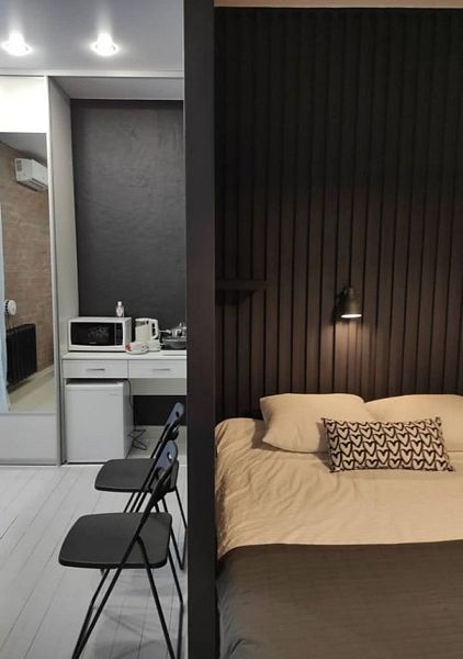 Комфортно разместиться в апартаментах студия смогут 2 человек (двуспальная кровать).
