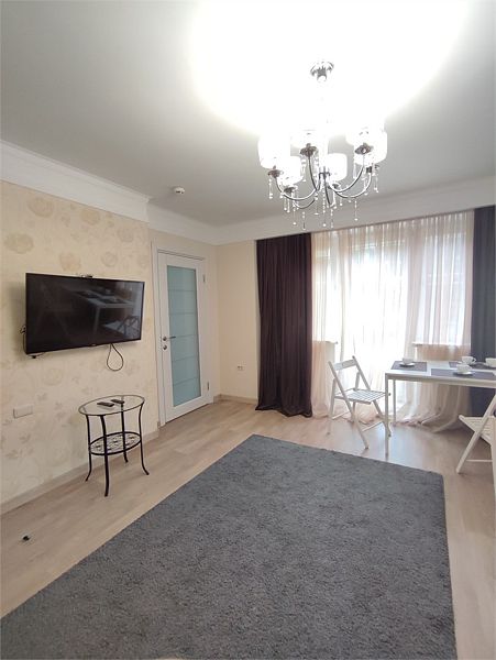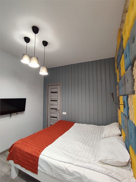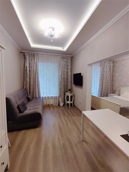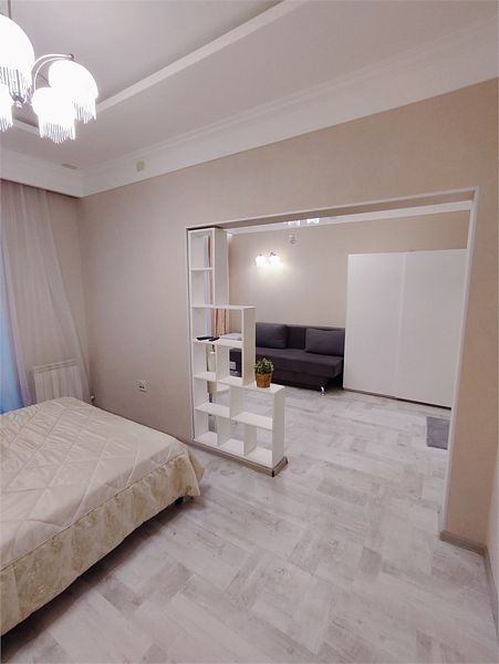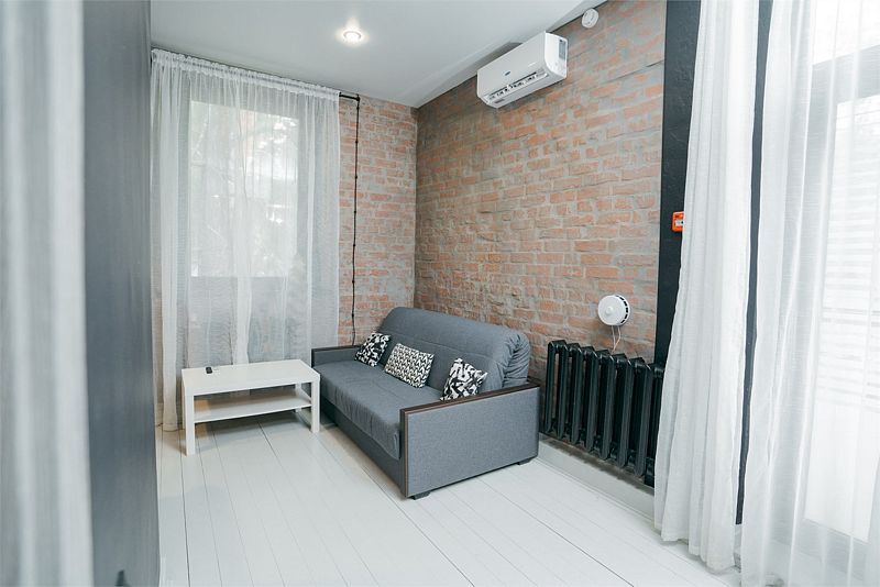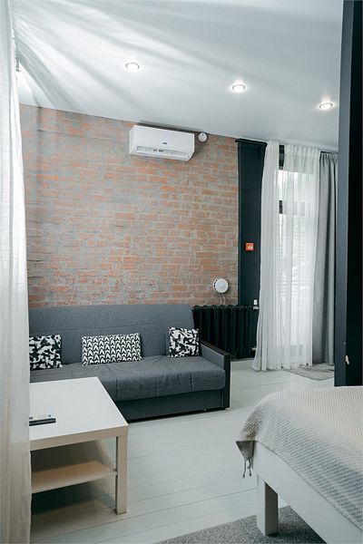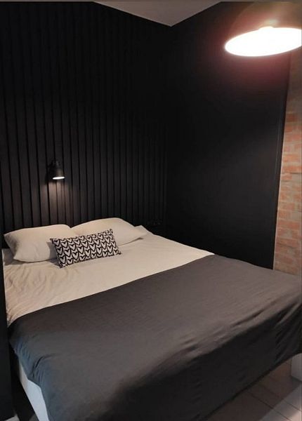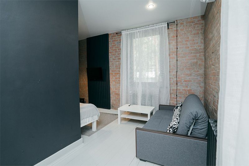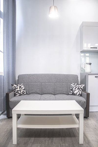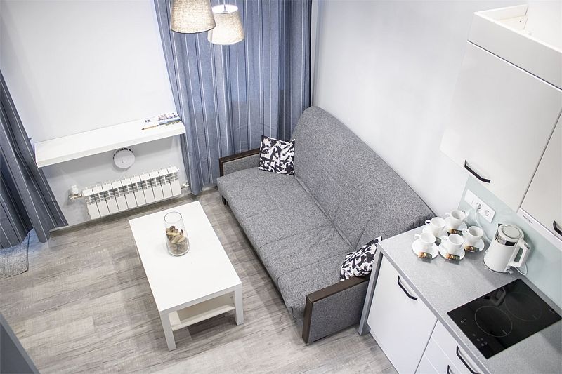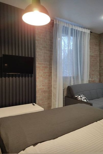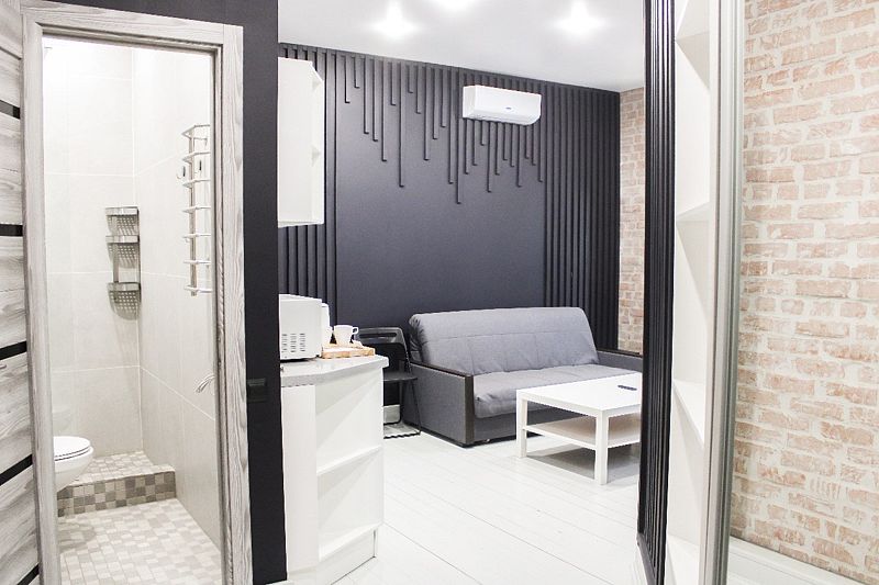 Комфортно разместиться в апартаментах студия смогут 3 человек (двуспальная кровать и раскладной диван).