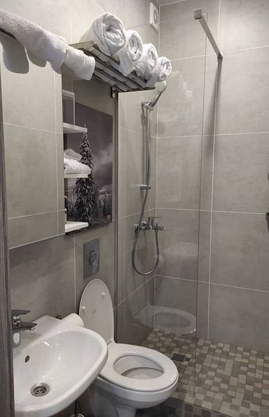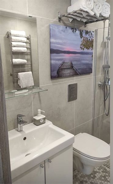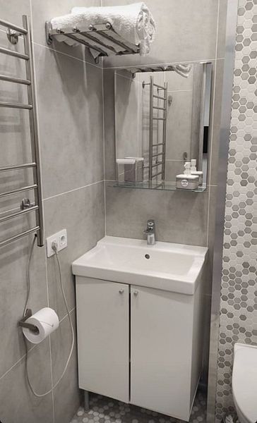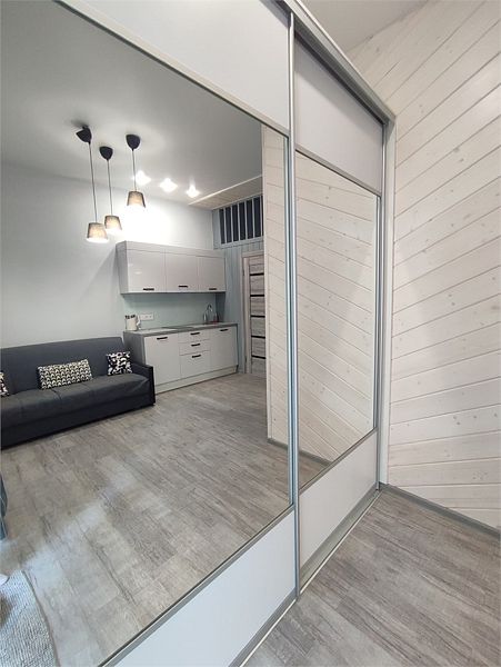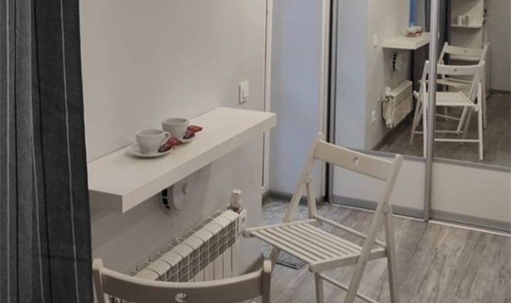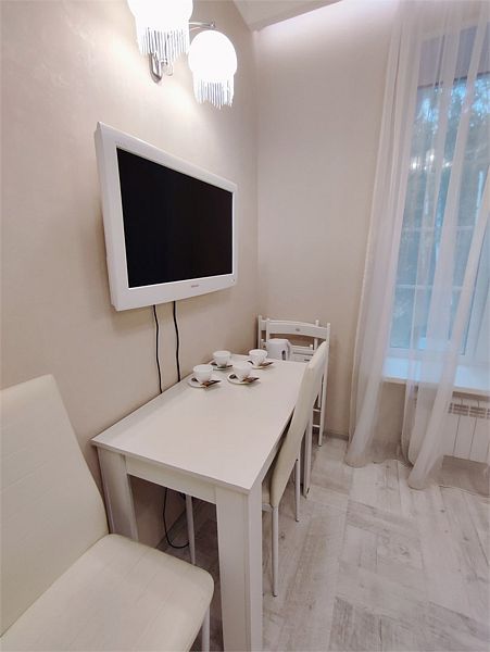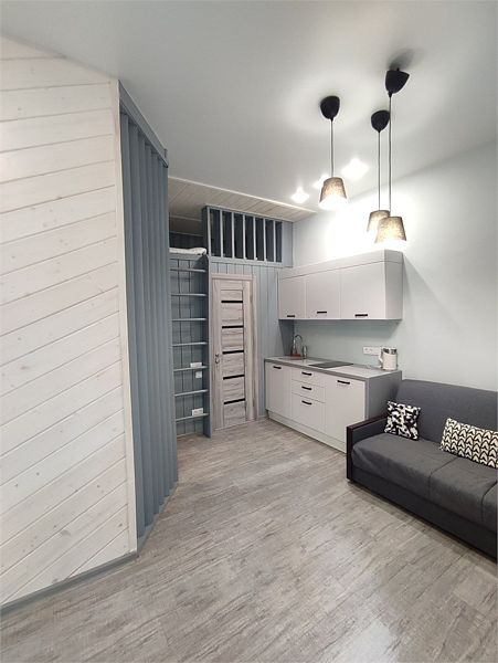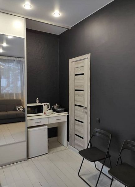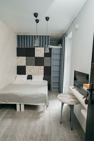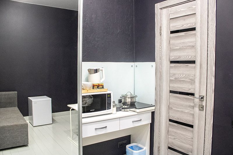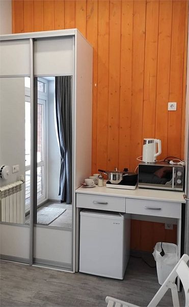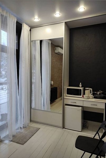 Комфортно разместиться в апартаментах студия смогут 3 человек (две односпальные кровати и антресоль).