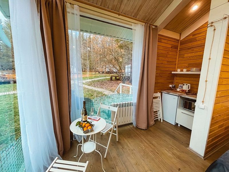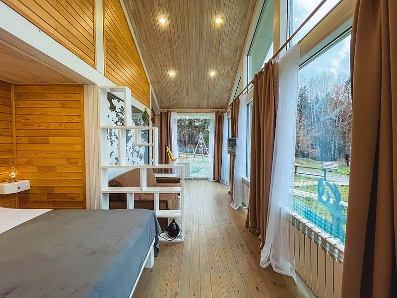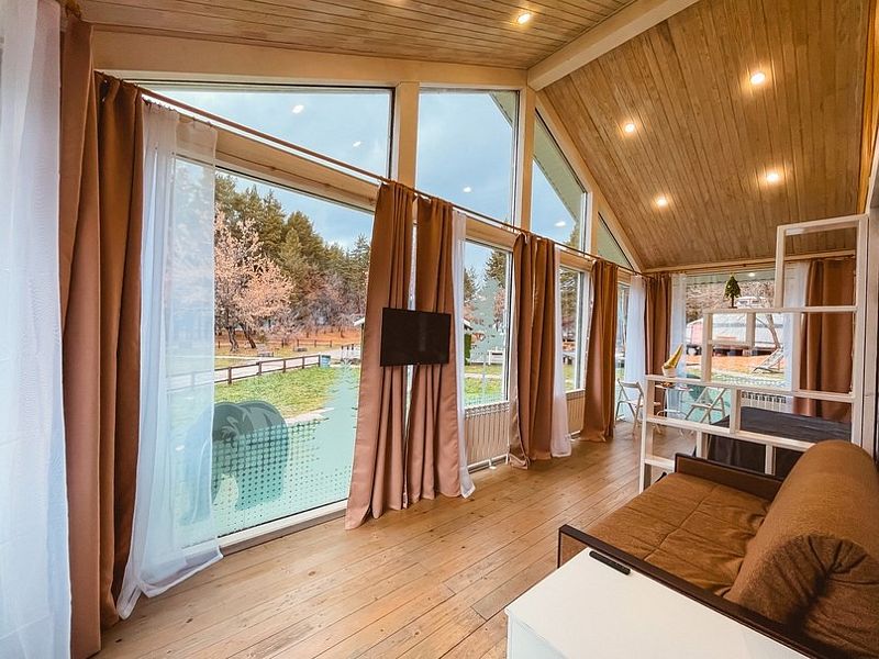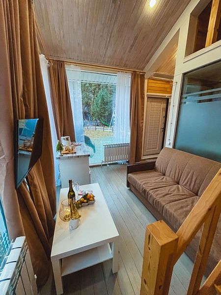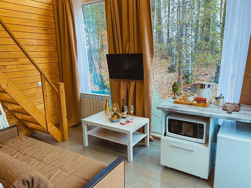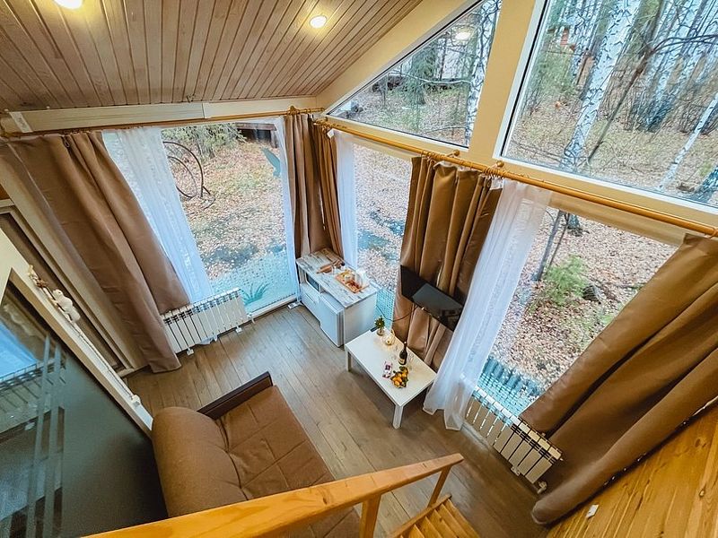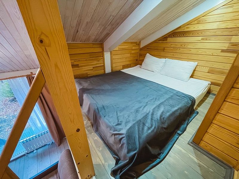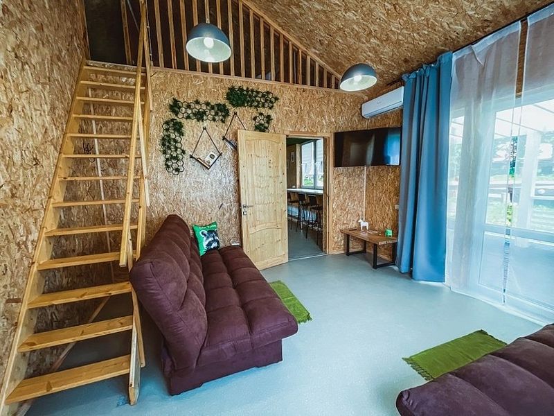 НедостаткиНе понравилось, что в домике все хлипкое. Свет то включался, то не включался, лампочка мигала. Позвонили администратору. Пришел электрик починил. Диван проваливался, лестница с узкими ступеньками, не по стандарту, очень крутая даже для взрослого) Если с маленькими детьми, то проблематично.