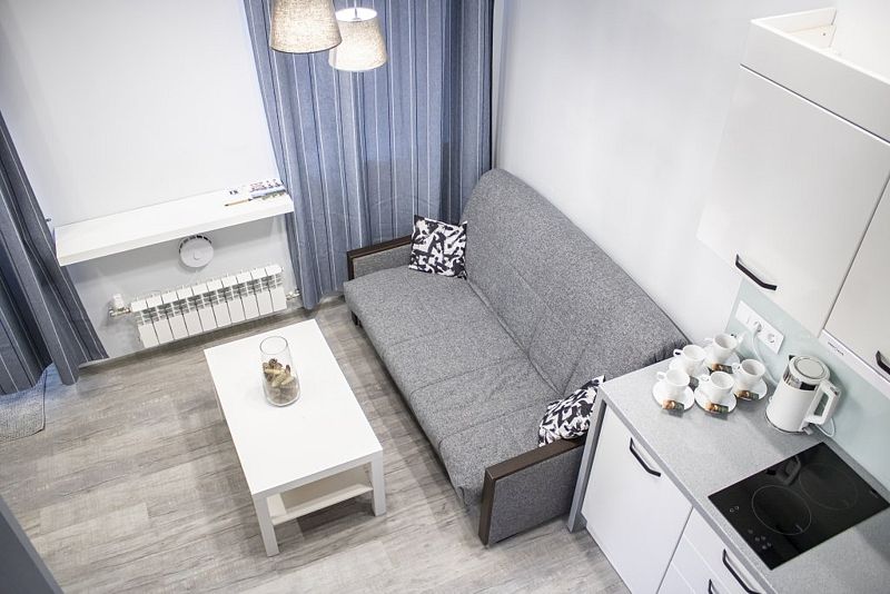 Комфортно разместиться в апартаментах студия смогут 4 человека (двуспальная кровать и раскладной диван).