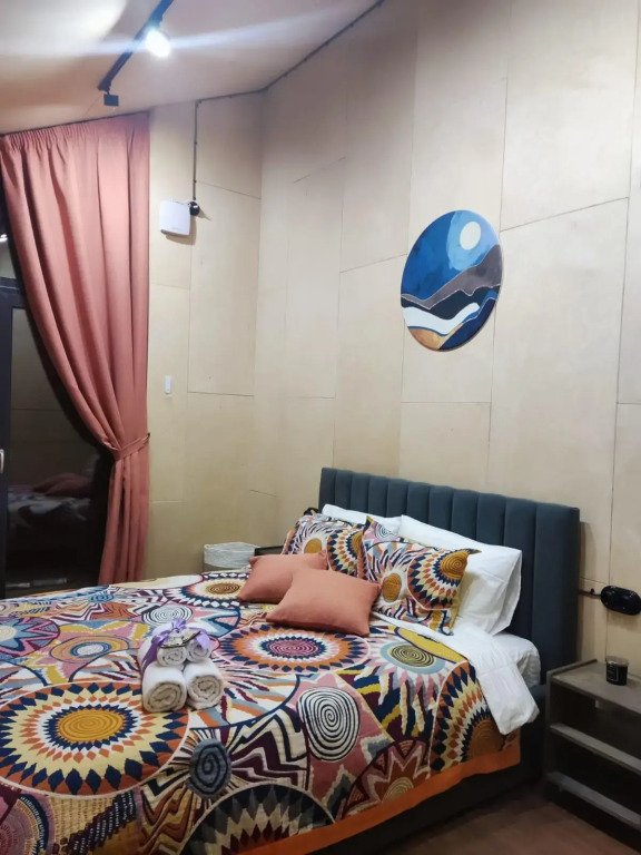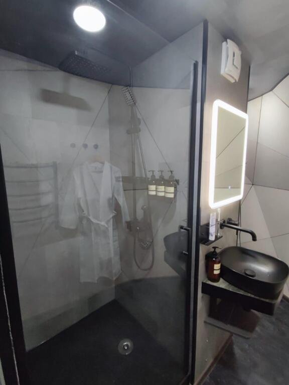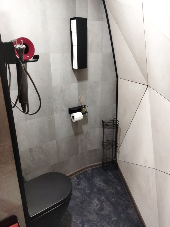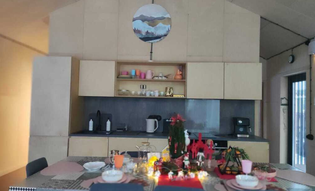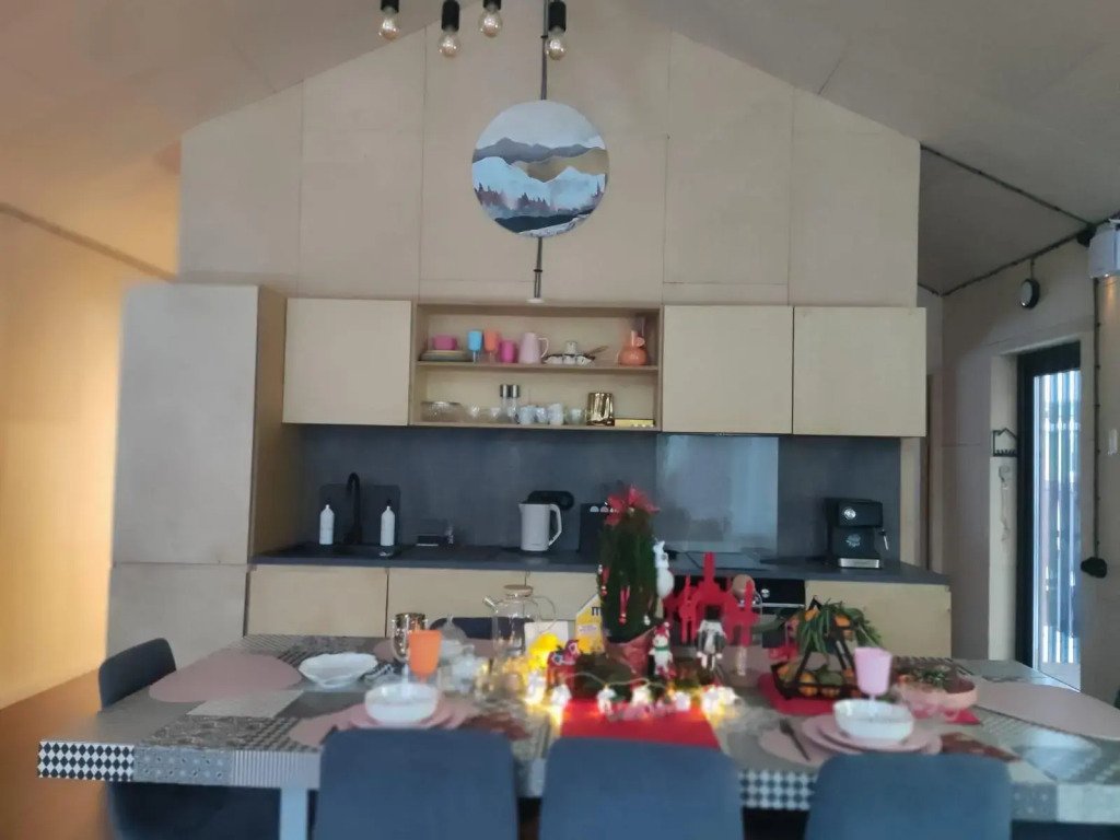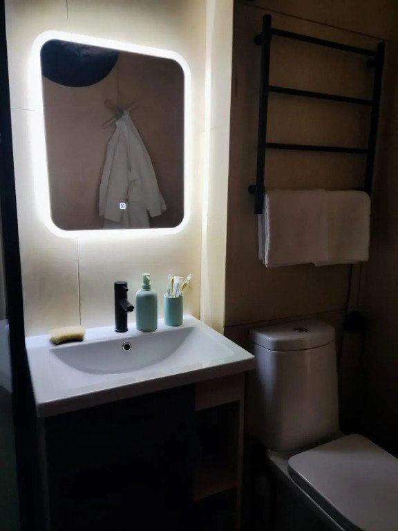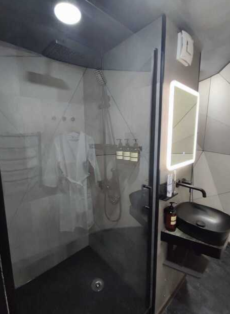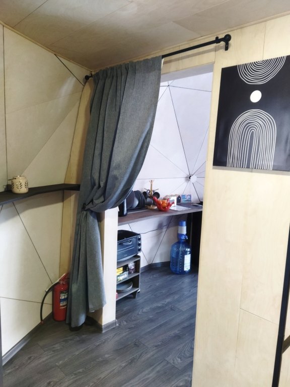 Спальня-студия с панорамным видом на лес, с круглой кроватью диаметром 2 м, кухонной зоной, антресолью для детей и/или взрослых со спальным местом 140*200, санузел, прихожая, терраса 12*9,5 м. Удобная и стильная мебель, техника, вся необходимая посуда, чистое белье, банные халаты и полотенца, также мыльные принадлежности.