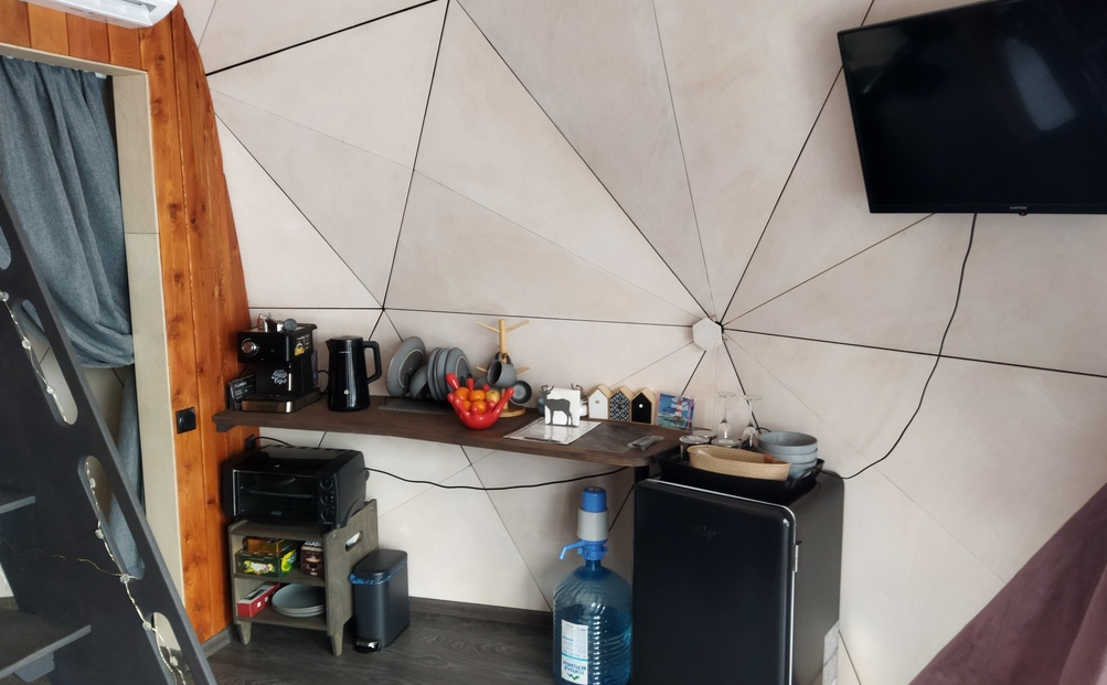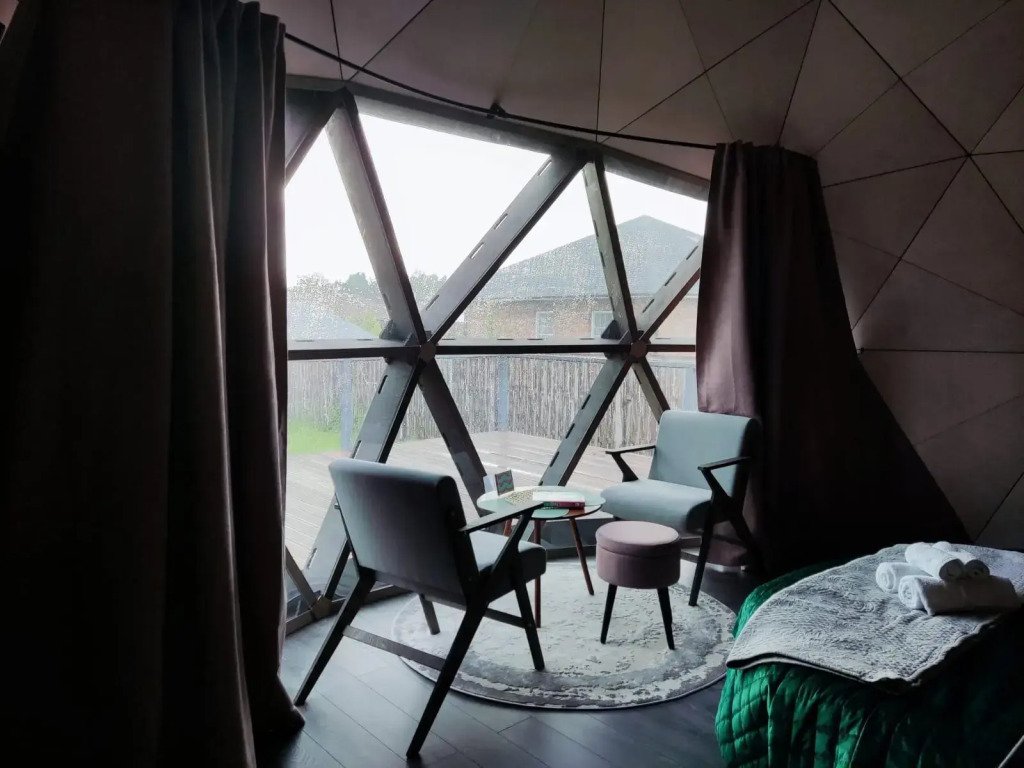 Для проживания доступен Геокупол и Барнхаус, которые находятся на участке в 9 соток. В домах предусмотрены все необходимые для комфортного проживания удобства, а стильный современный интерьер добавит уюта и атмосферы.
