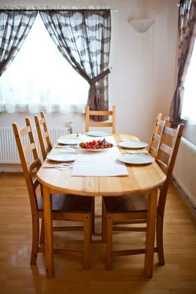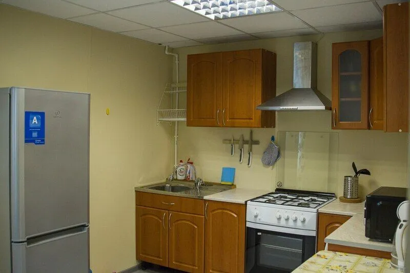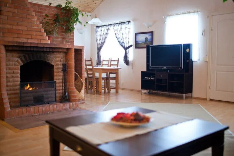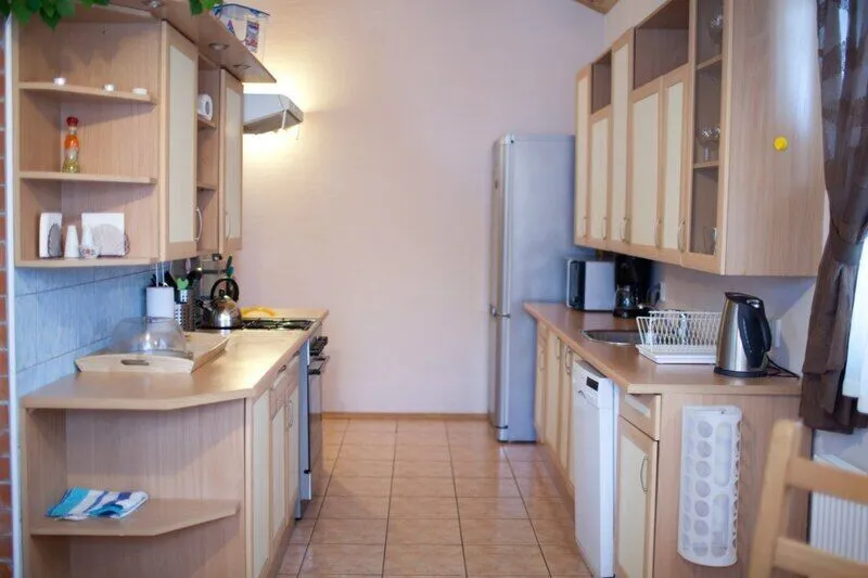 Холодильник, газовая плита, отопление (теплый пол) а также небольшой камин, набор всей необходимой посуды.
