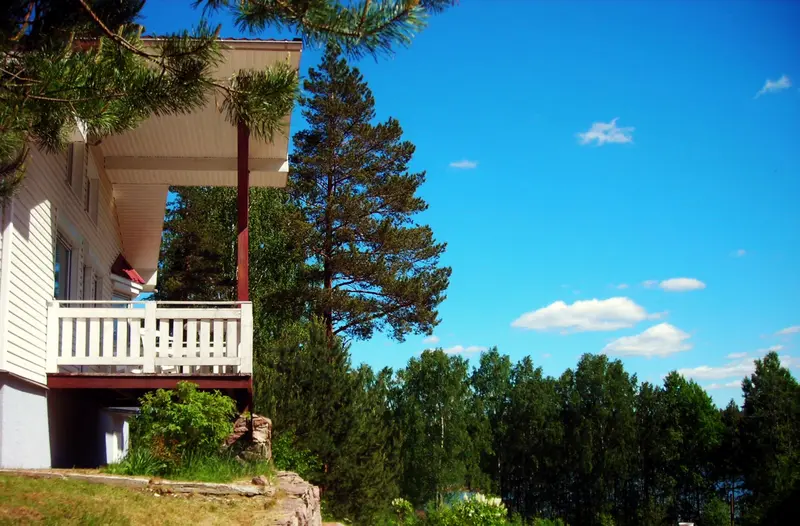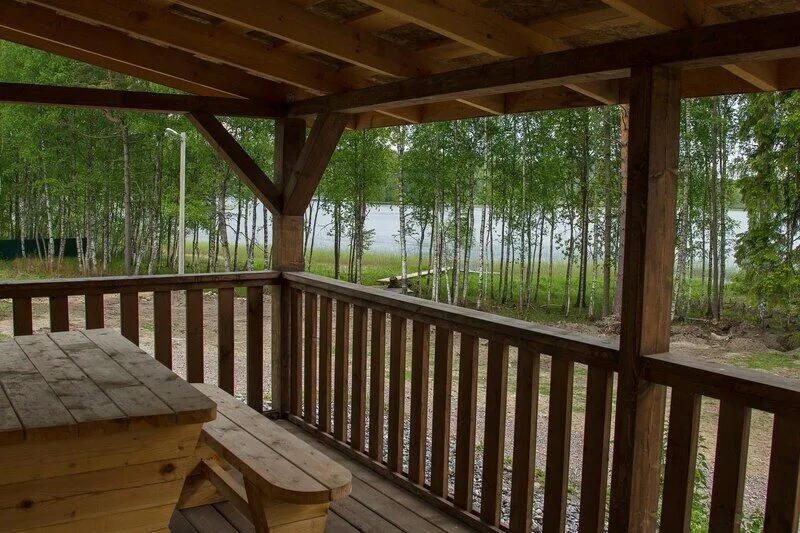 С террасы домика открывается вид на озеро. На террасе стол и скамейки.