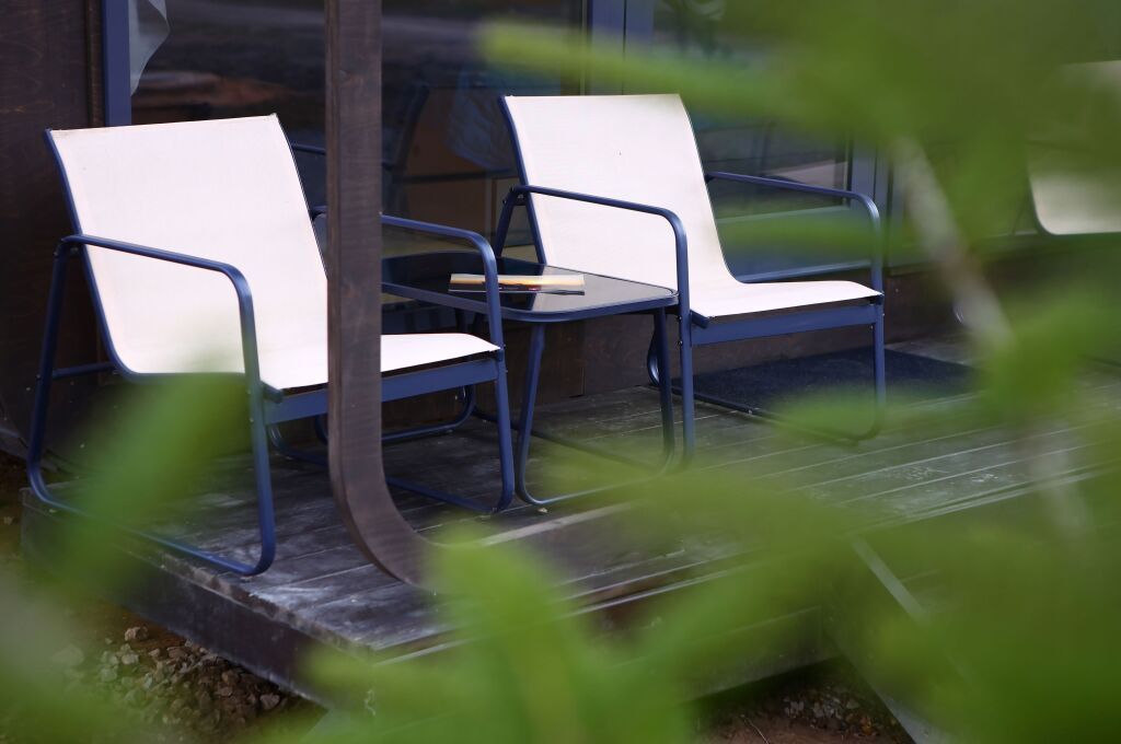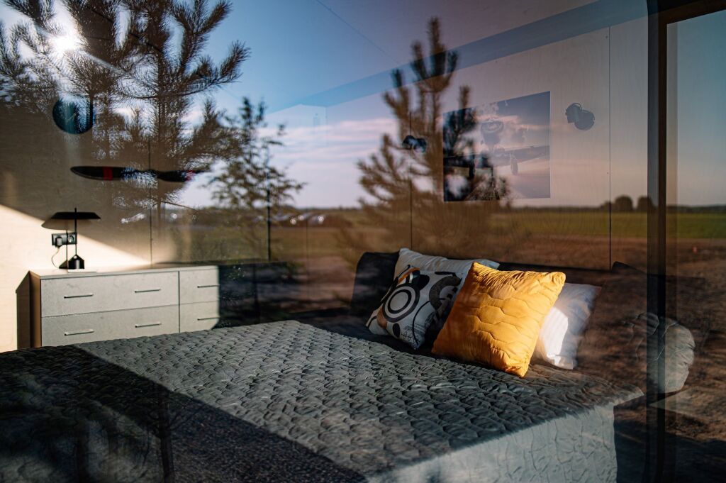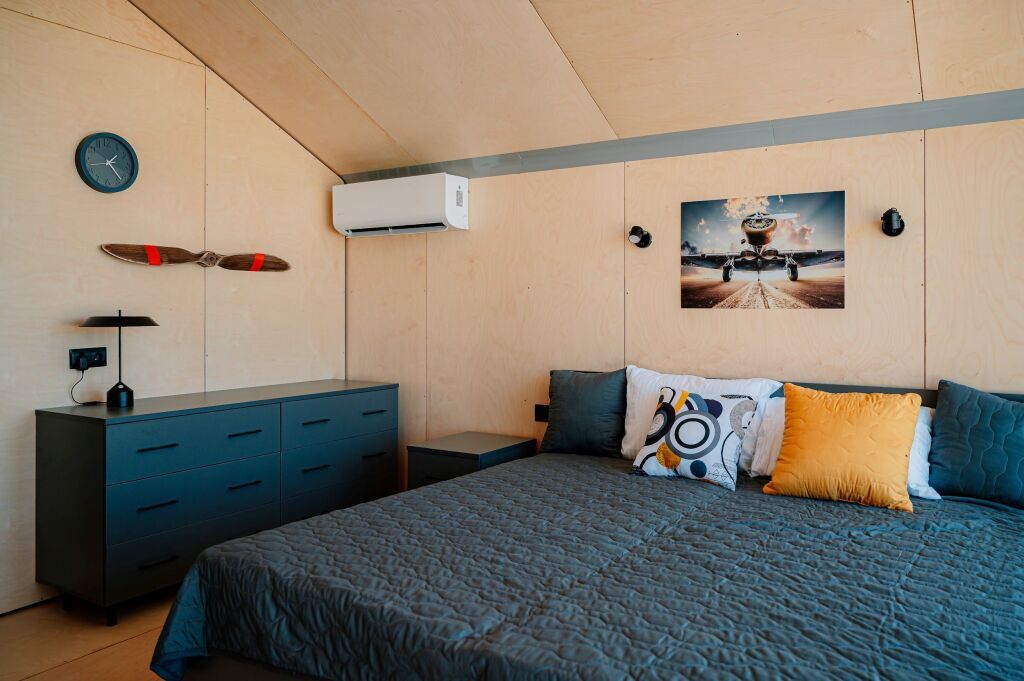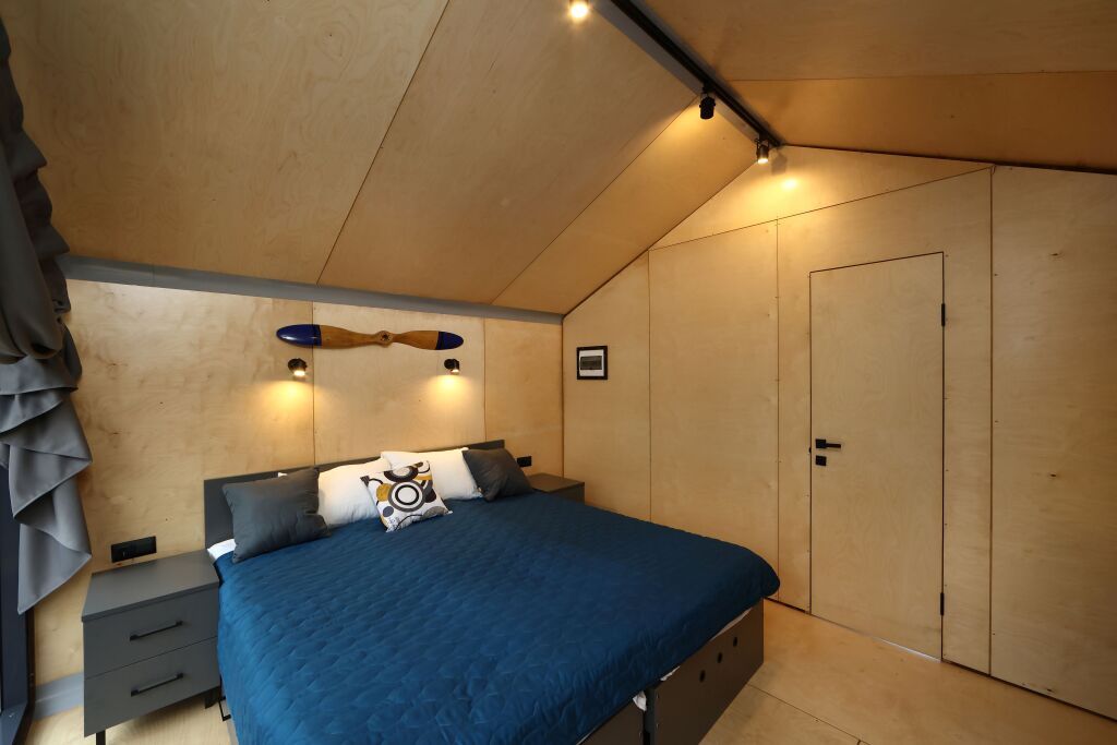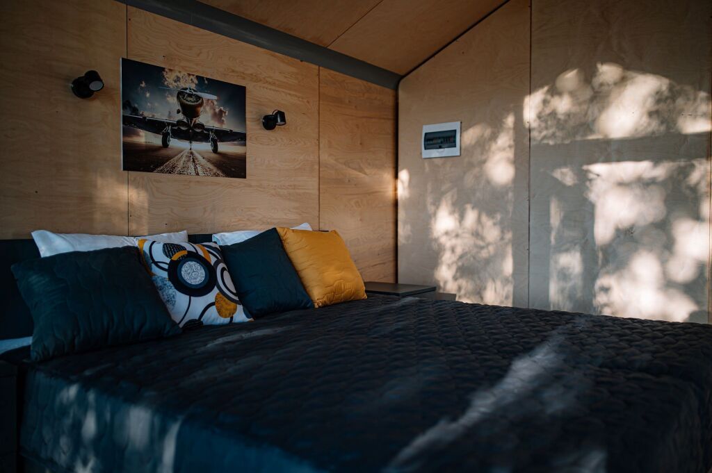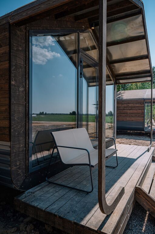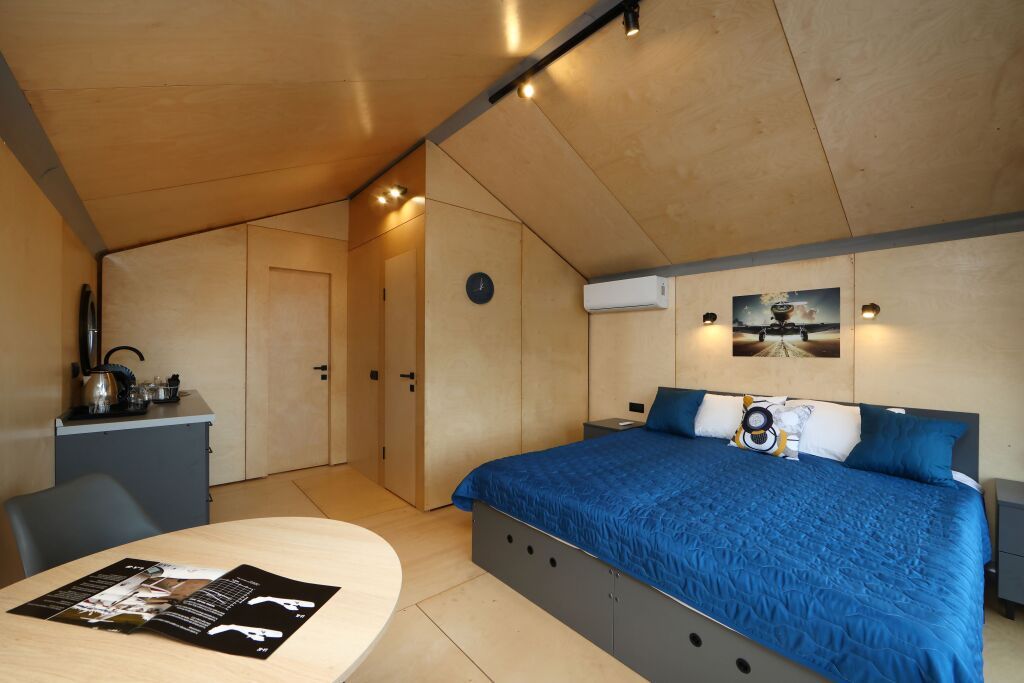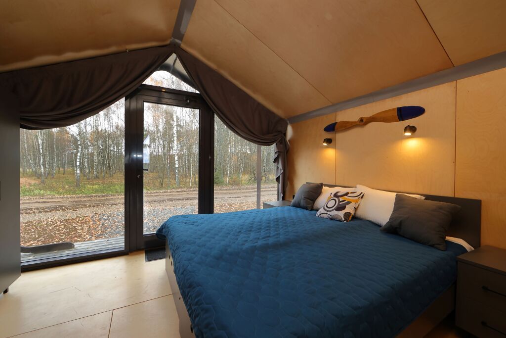 Уютный 2-местный домик (двуспальная кровать) с панорамными окнами на аэродром, на лес и крытой верандой.