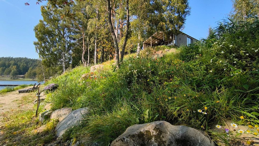 Коттедж у обрыва. С террасы, площадью 25 кв. м. открывается вид на пляж и озеро.