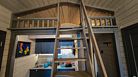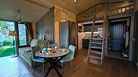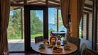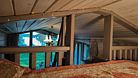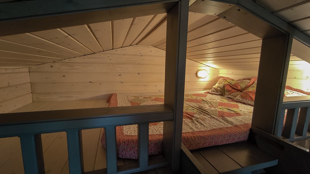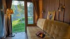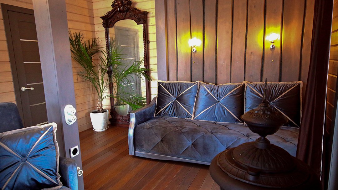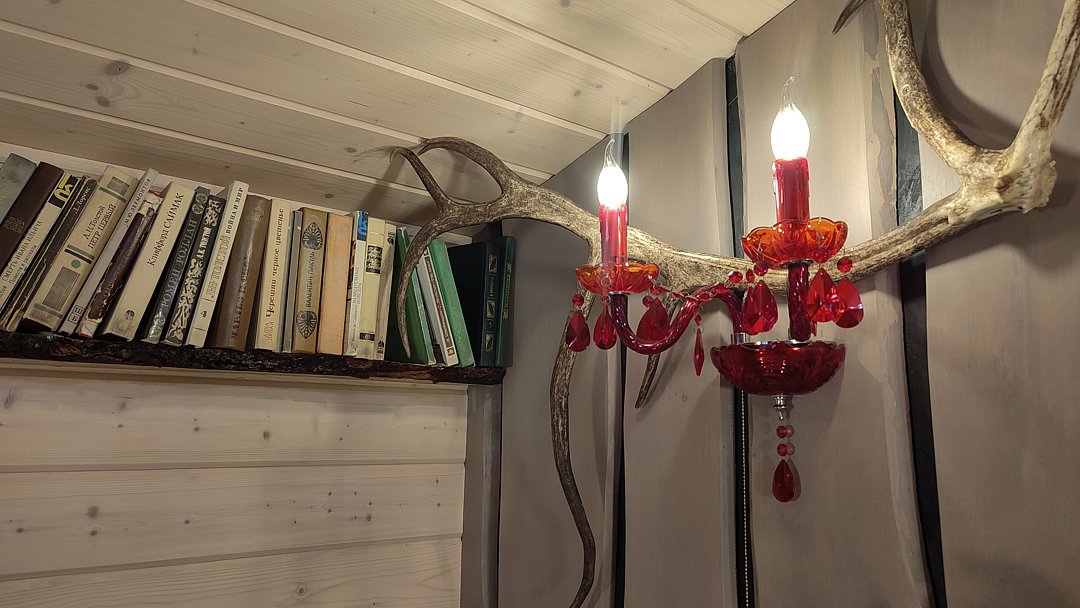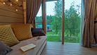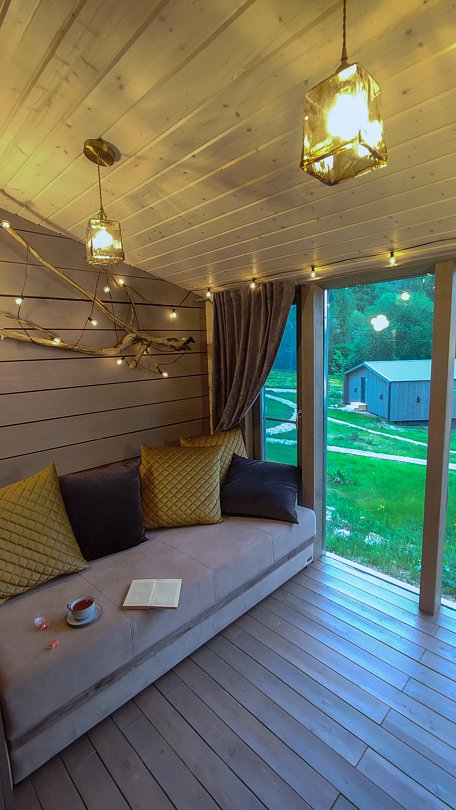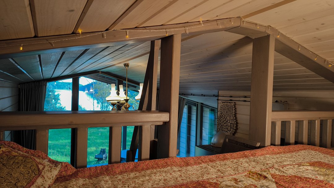 - небольшая гостиная имеет огромное панорамное стену-окно. Диван находится в уютном уголке, напротив панорамного окна. Уютные бра придадут Вашему отдыху комфорт и уют. Прямо из зала по лестнице «гусиный шаг» можно забраться под крышу, где в Вашем распоряжении лежанка, на которой удобно одновременно и любоваться видами озера, и поддерживать контакт с друзьями внизу. Читать книгу и просто …заснуть;