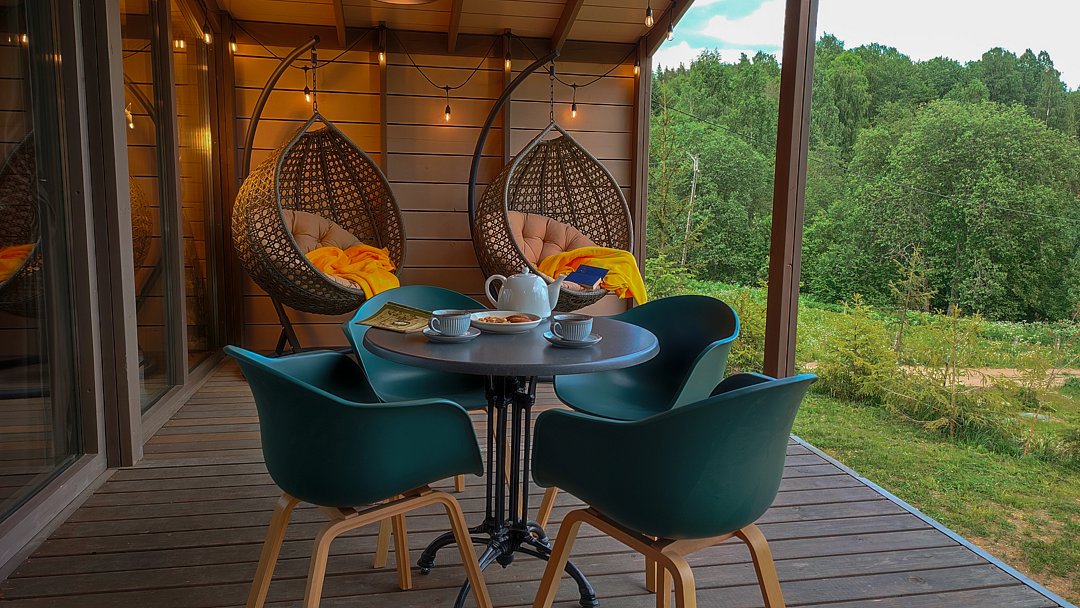 На террасе 2 кресла-качели, стол с 4 стульями.