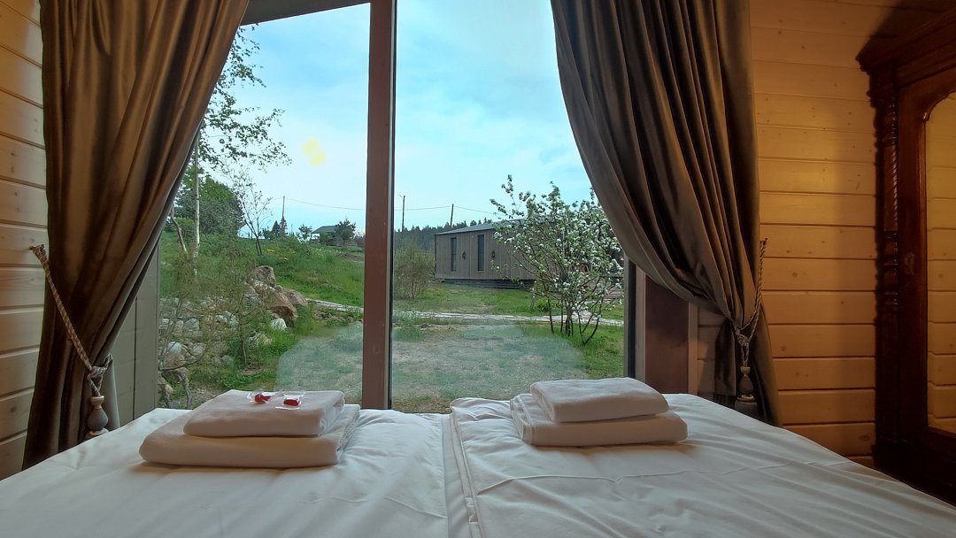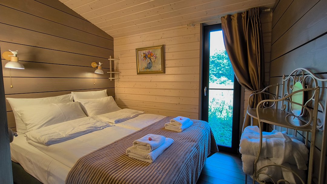 - 2 спальни. Окна одной выходят на поле, где пасутся коровы, за полем зеленый массив. Окна второй спальни смотрят на озеро;