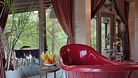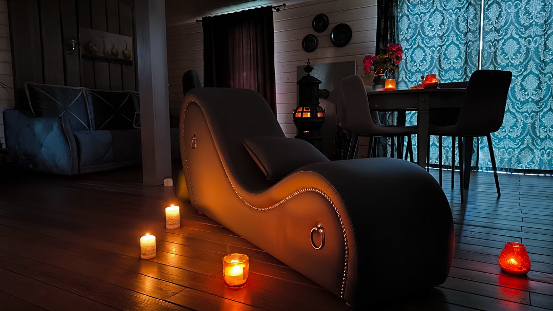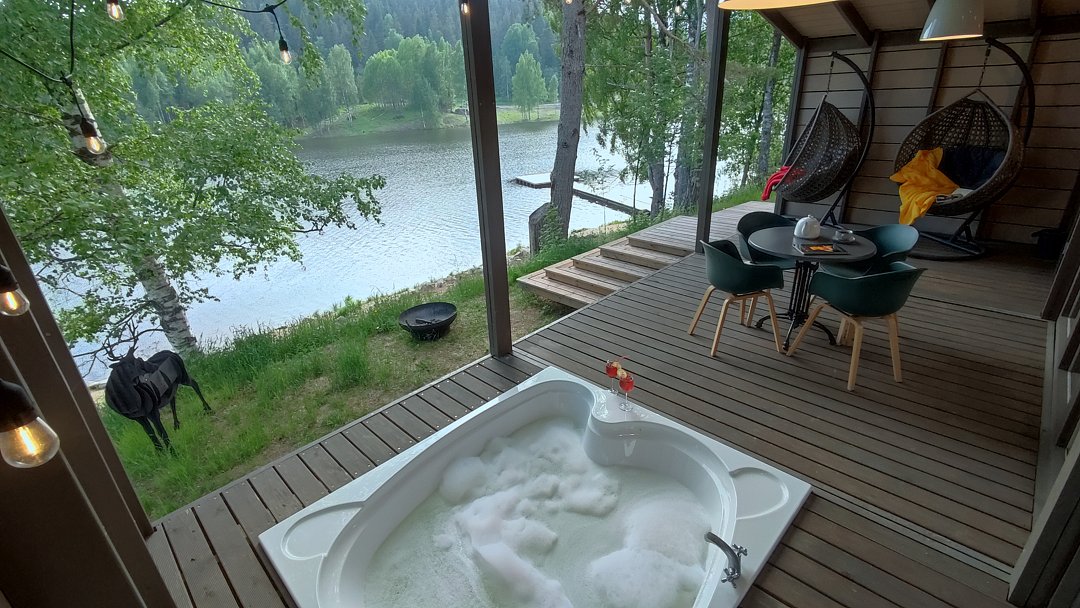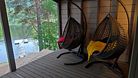 На террасе 2 кресла-качели, стол с 4 стульями и большая ванна на двоих, что реализует возможность принимать водные процедуры круглый год, несмотря на погоду.