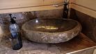 - красного мрамора отдельно стоящая у окна ванна на лапах,
