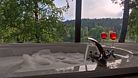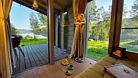 Баня-бочка с большим панорамным окном, из парилки вид на озеро.