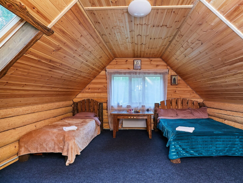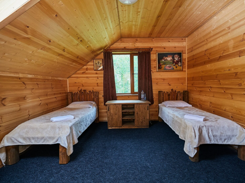 Двухэтажный дом для 4 чел. В доме два 2-х местных номера, два санузла, душевая кабина и общий зал с камином.