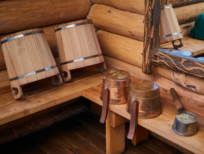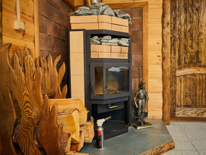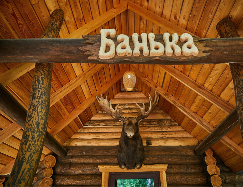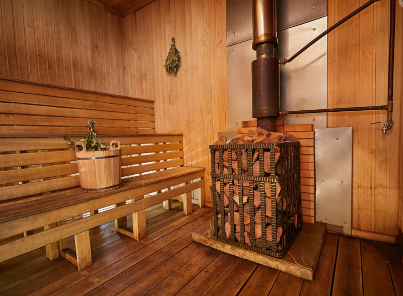 Настоящая русская баня на дровах, с вениками, арома-маслами и обливным ведром с ледяной водой. В бане есть большая зона отдыха с камином, столом и диванами. Здесь есть возможность поиграть в карты, нарды, заказать напитки, закуски и кальян в баре.