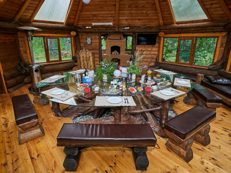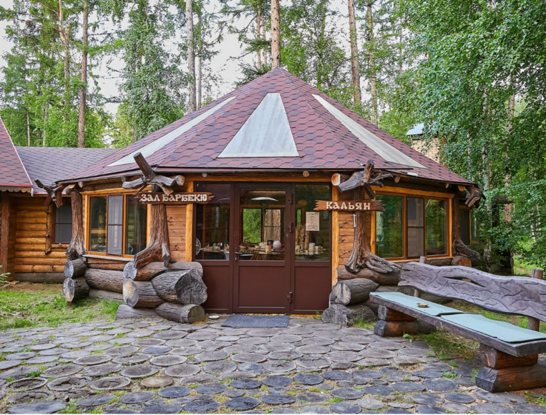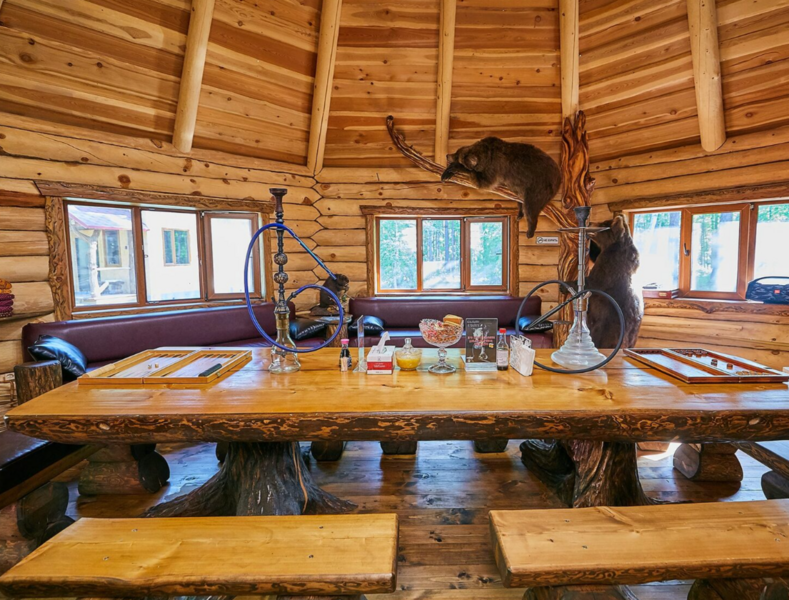 Стильный зал с круглым стеклянным столом, основание которого изготовлено из корней морёной лиственницы. Отдельная мангальная зона с возможностью самостоятельно приготовить плов, шашлыки и другие блюда на костре.