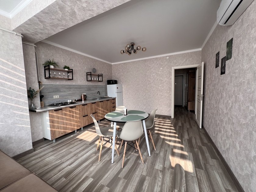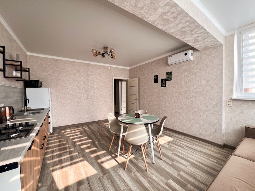 Квартира расположена в шаговой доступности от автовокзала, гипермаркета Магнит и KФС. Рядом есть сквер для прогулок и детская площадка. В семи минутах езды находится железнодорожный вокзал и всего восемь минут до аэропорта. Заселение в любое время суток.