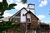 Здание отеля 3-этажное с открытой террасой для отдыха и небольшой парковкой.
