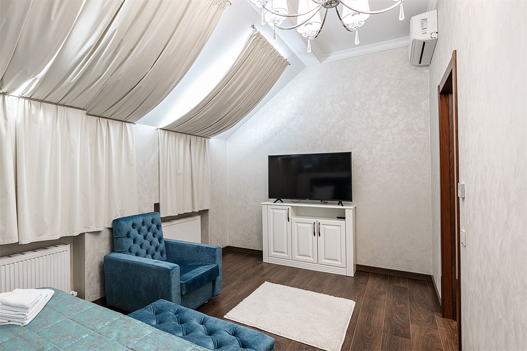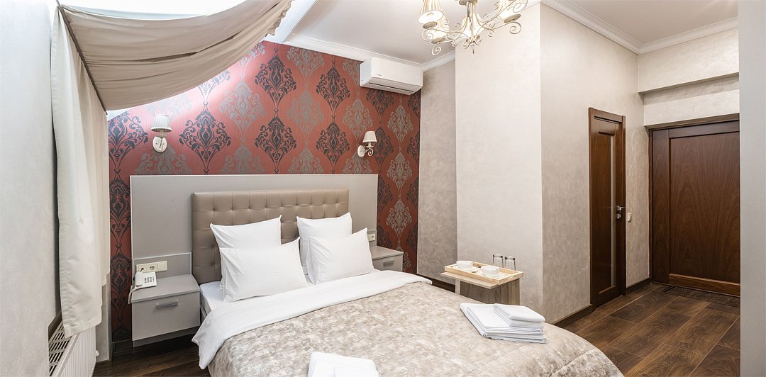 Wi-Fi, фен, утюг, факс, душевая кабина, халаты, банные полотенца, тапочки, гигиенические средства, двуспальная кровать, гладильная доска, тумбы, шкаф для одежды, вешалки, обеденный стол, зеркало, звуконепроницаемые стены и окна, чайный набор, обслуживание номеров, информационная карта, меню, сейф, унитаз, раковина, питьевая вода, кулер на этаже, ламинат, стаканы, стиральная машина и сушилка, кофейный столик, туалет, сплит-система, цифровое тв, внутренний телефон, мини-холодильник, мансардные окна, телевизор со Smart TV, номер для некурящих, можно с питомцамиВ гостиничном номере