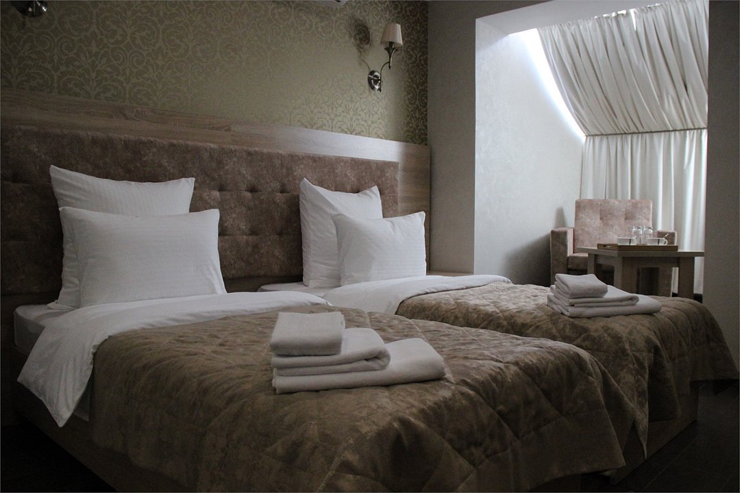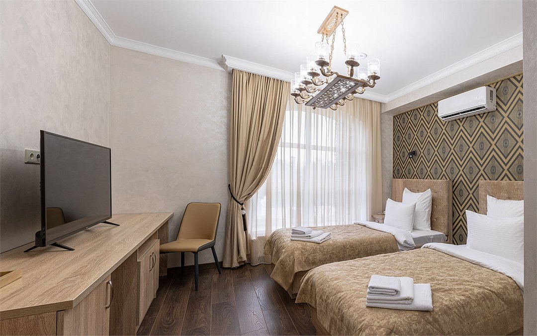 Просторный стандартный 2-местный 1-комнатный номер площадью до 25 кв.м предназначен для гостей, пребывающих с деловыми целями. Номера отличаются особо широкими кроватями и наличием рабочего стола с эргономичными стульями. Просторный санузел оборудован душевой со стеклянным ограждением, а также имеется гигиенический душ. В отделке номеров использованы современные гипоаллергенные материалы. Дизайн комнат и санузлов выполнен в теплых нейтральных тонах с аспектом на стильных деталях.Услуги и удобства