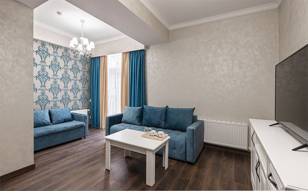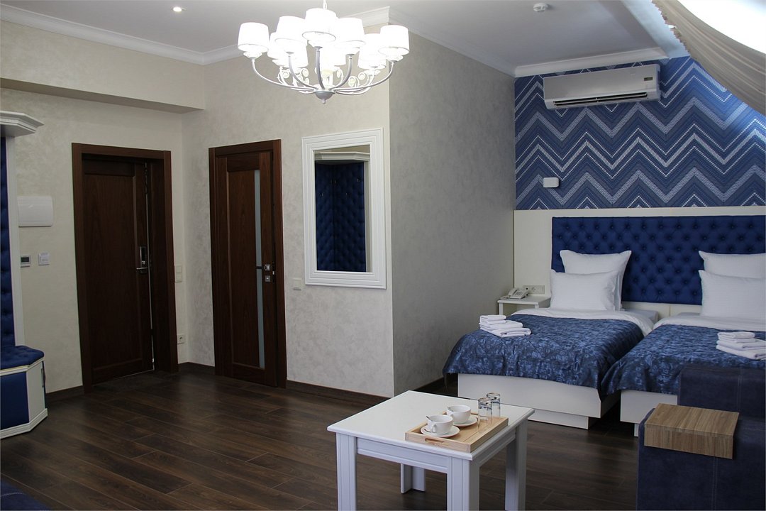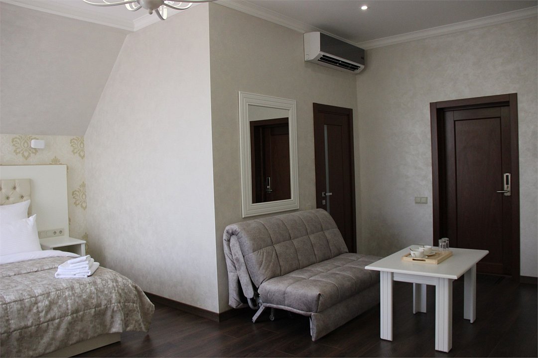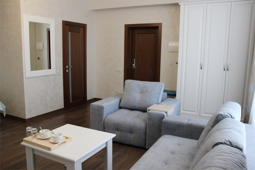 Классический 2-комнатный номер повышенного комфорта идеально подойдет как для размещения индивидуальных гостей, так и для семьи. Уютная стильная спальня подарит крепкий сон и прекрасное ощущение тепла и комфорта. Гостиная имеет выход на просторную индивидуальную террасу, где приятно посидеть с друзьями на свежем воздухе. Просторный санузел оборудован душевой со стеклянным ограждением, а также имеется гигиенический душ. В отделке номеров использованы современные гипоаллергенные материалы. Дизайн комнат и санузлов выполнен в теплых нейтральных тонах с аспектом на стильных деталях.Услуги и удобства