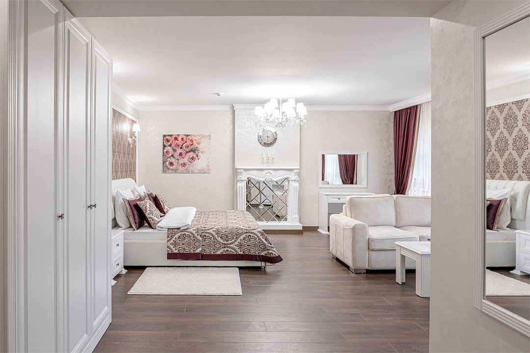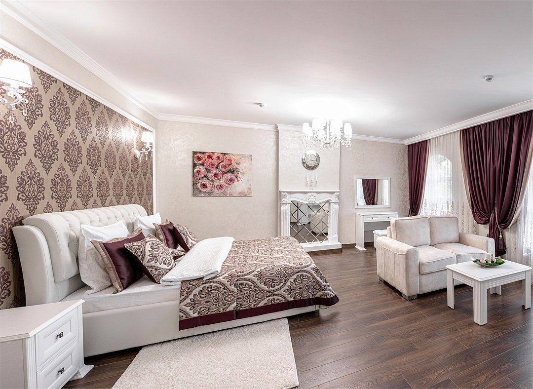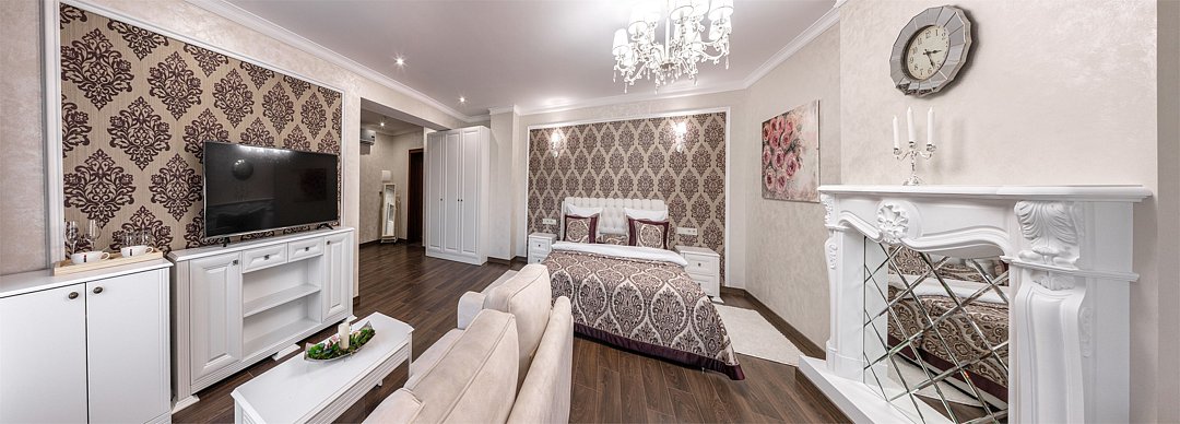 Уникальный дизайнерский номер площадью 47 кв. м станет идеальным подарком молодожёнам и романтическим парам в самый важный день в жизни. Преобладание белого цвета в отделке комнаты и мебели создает непревзойденное ощущение легкости, чистоты и торжества. Широкая кровать снабжена высококачественным матрасом и дополнена набором мягкой мебели с журнальным столиком. Тщательно подобранные детали отделки и интерьера отлично подойдут для частных и свадебных фото-сессий. Просторный санузел оборудован угловой ванной. В отделке номеров использованы современные гипоаллергенные материалы. Дизайн комнат и санузлов выполнен в теплых нейтральных тонах с аспектом на стильных деталях.Услуги и удобства