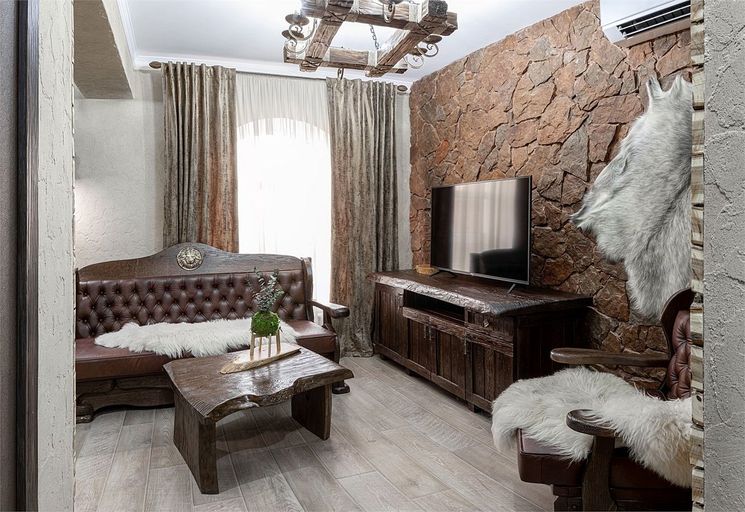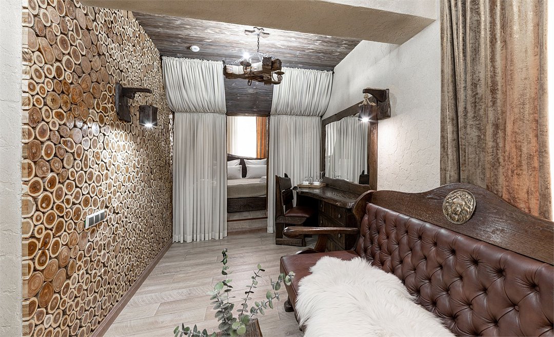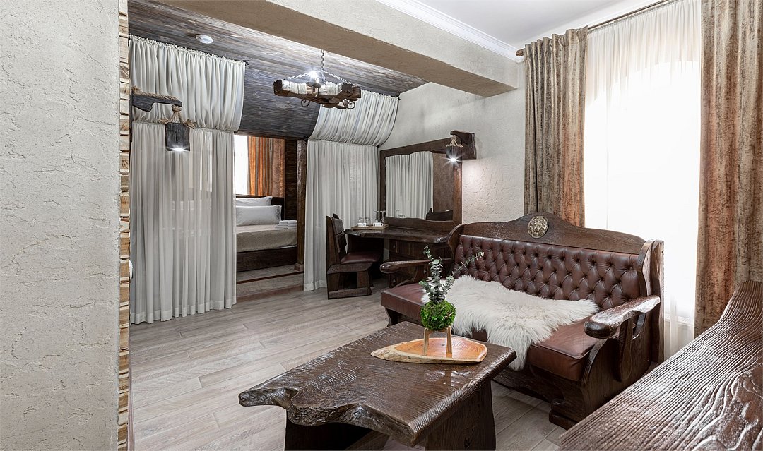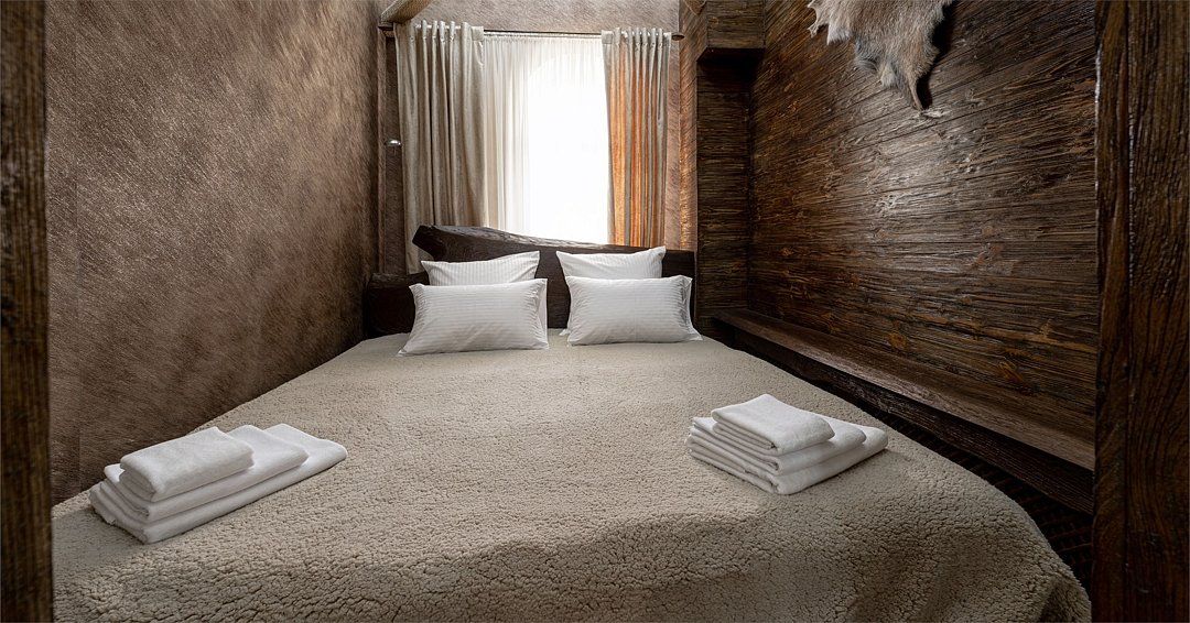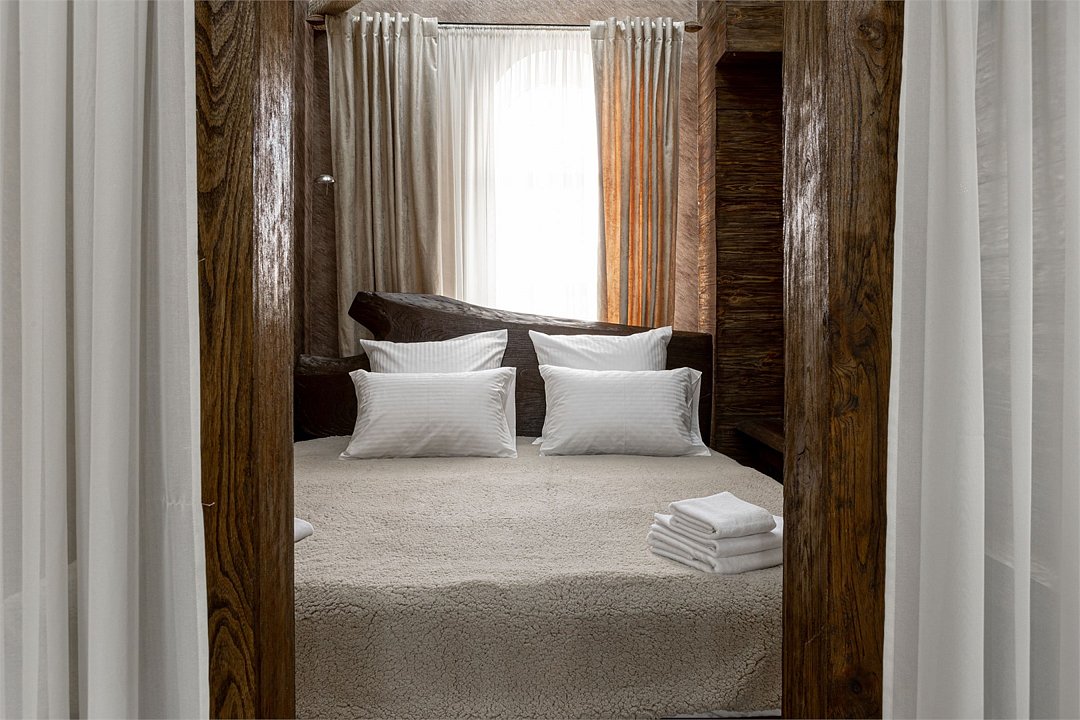 Дизайнерский люкс «Башня» - это воплощенная мечта для тех, кто ценит натуральные материалы в отделке помещения: дерево, кожа, натуральный мех. Дизайн комнаты безусловно понравится харизматичным мужчинами, а также произведет неизгладимое впечатление на взыскательных женщин. Мебель и предметы интерьера подобраны не только по стилю, но и по возможности полезного и удобного использования. Просторный санузел оборудован душевой со стеклянным ограждением, а также имеется гигиенический душ.Услуги и удобства