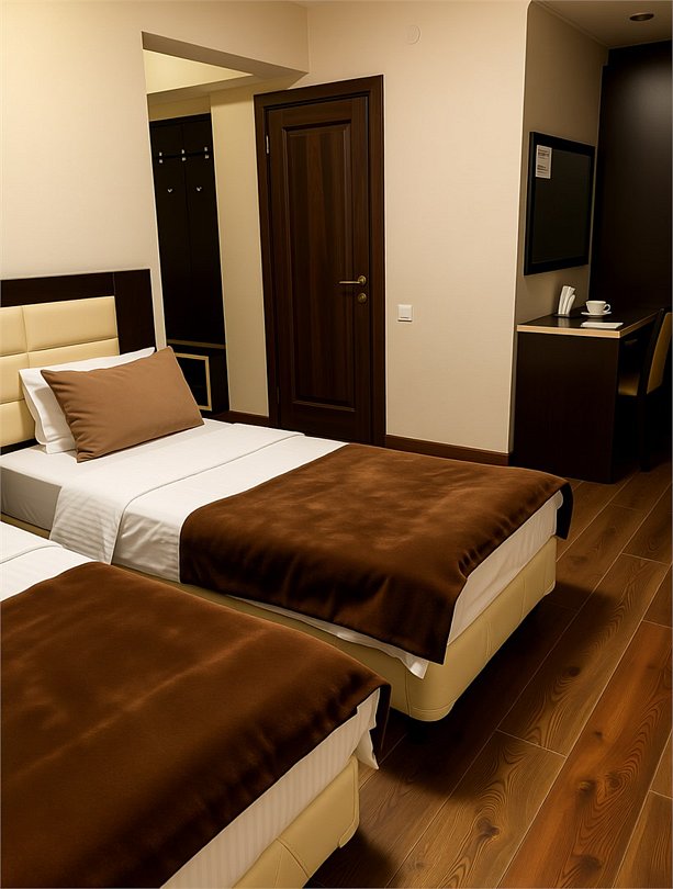 Откройте для себя комфорт в номере 'СТАНДАРТ' с раздельными кроватями. Этот просторный номер с видом на город идеально подходит для вашего отдыха или работы. В вашем распоряжении рабочий стол и набор с чаем и кофе, бутилированная вода и мини-холодильник для удобства. В ванной комнате вас ждут отельная косметика, фен, мягкие полотенца и тапочки для максимального комфорта."Услуги и удобства