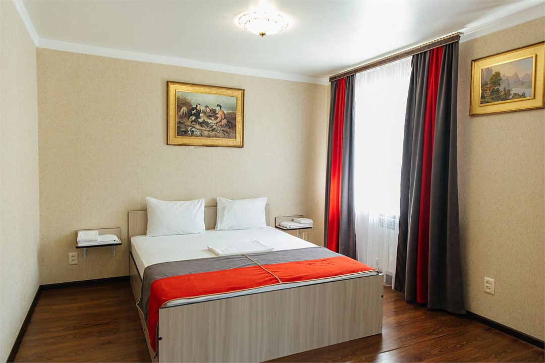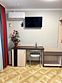 телевизор, спутниковое телевидение, Wi-Fi, интернет, кондиционер, фен, санузел, тапочки, косметические средства, двуспальная кровать, шкаф для одежды, вешалки, письменный стол, багажная тумба, зеркало, унитаз, раковина, обеденная зона, отопление, душ, кресло, вид во двор, ламинат, туалетные средства, туалет, москитная сетка, номер для некурящих, антибактериальное средство для рук, уборка номера, набор для приготовления чая и кофе, вешалки-плечики, бутилированная водаВ номере